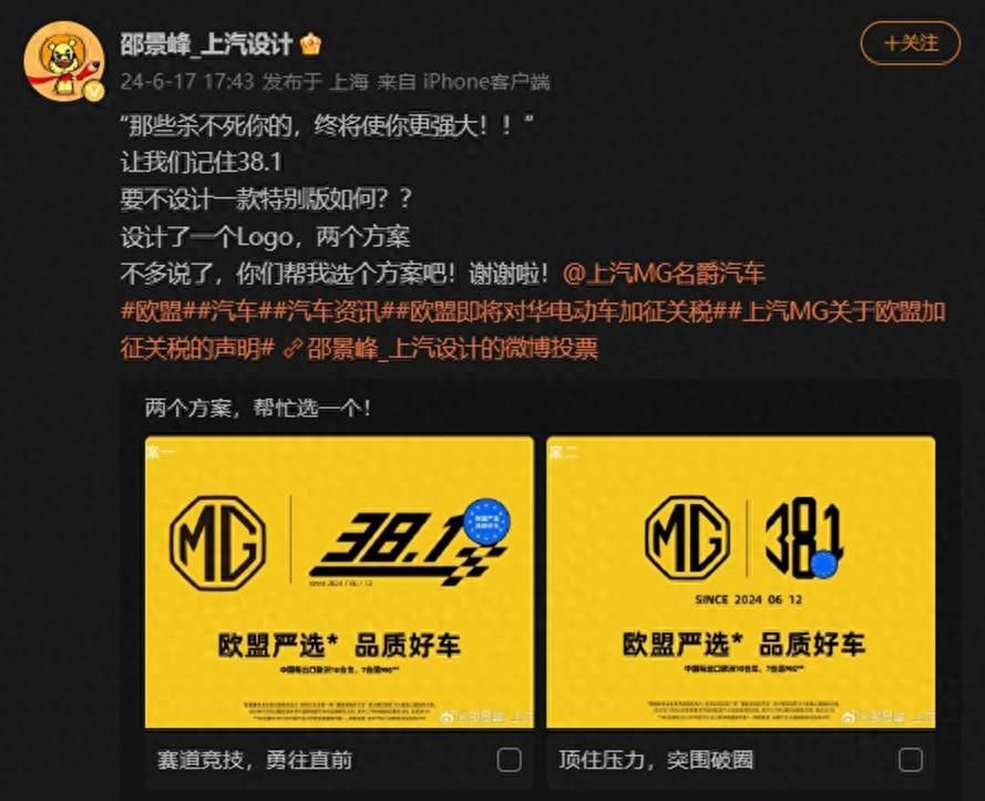 这一决定让上汽集团感到非常不满。上汽技术中心副总设计师邵景峰在网上发布了“MG”和“38.1”这两个品牌的宣传口号,并附上一句“欧洲严选好车”的标语,让大家自由选择。尽管他没有具体说明这笔税款将如何使用,但仍有许多人在社交媒体上@欧盟,引发了一阵热议。
