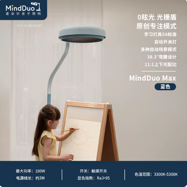 麦朵尔MinddouMax研发的原创专注光型技术,彻底颠覆了传统全域散光模式。它让光线如同舞台追光一般聚拢在桌面,就像给孩子的学习时光开启了一盏专属的“聚光灯”。经联合研究证实,这一技术能有效提升孩子专注力8.9%。