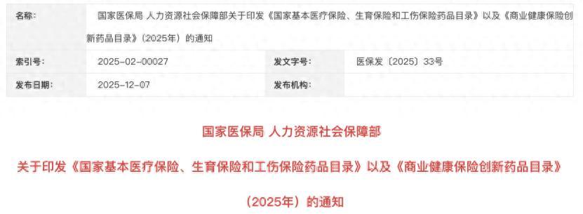 1. 国家医保局, 人力资源社会保障部. 关于印发《国家基本医疗保险、生育保险和工伤保险药品目录》以及《商业健康保险创新药品目录》(2025年)的通知. 医保发〔2025〕33号. 2025年12月7日.