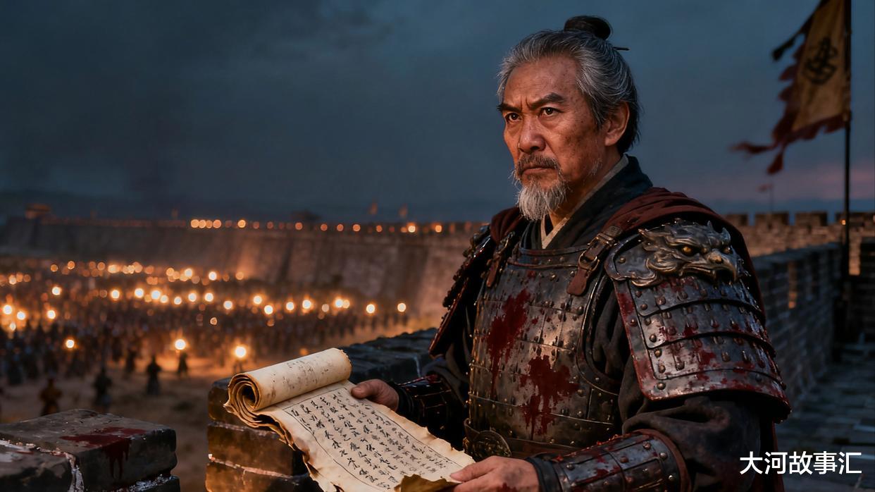 一位年过半百的将军独立城头,望着远处连绵的敌营灯火。他身形不高,面容平凡,唯有一双眼睛锐利如鹰。铠甲上血迹未干,手中握着一卷早已翻烂的《孙子兵法》。