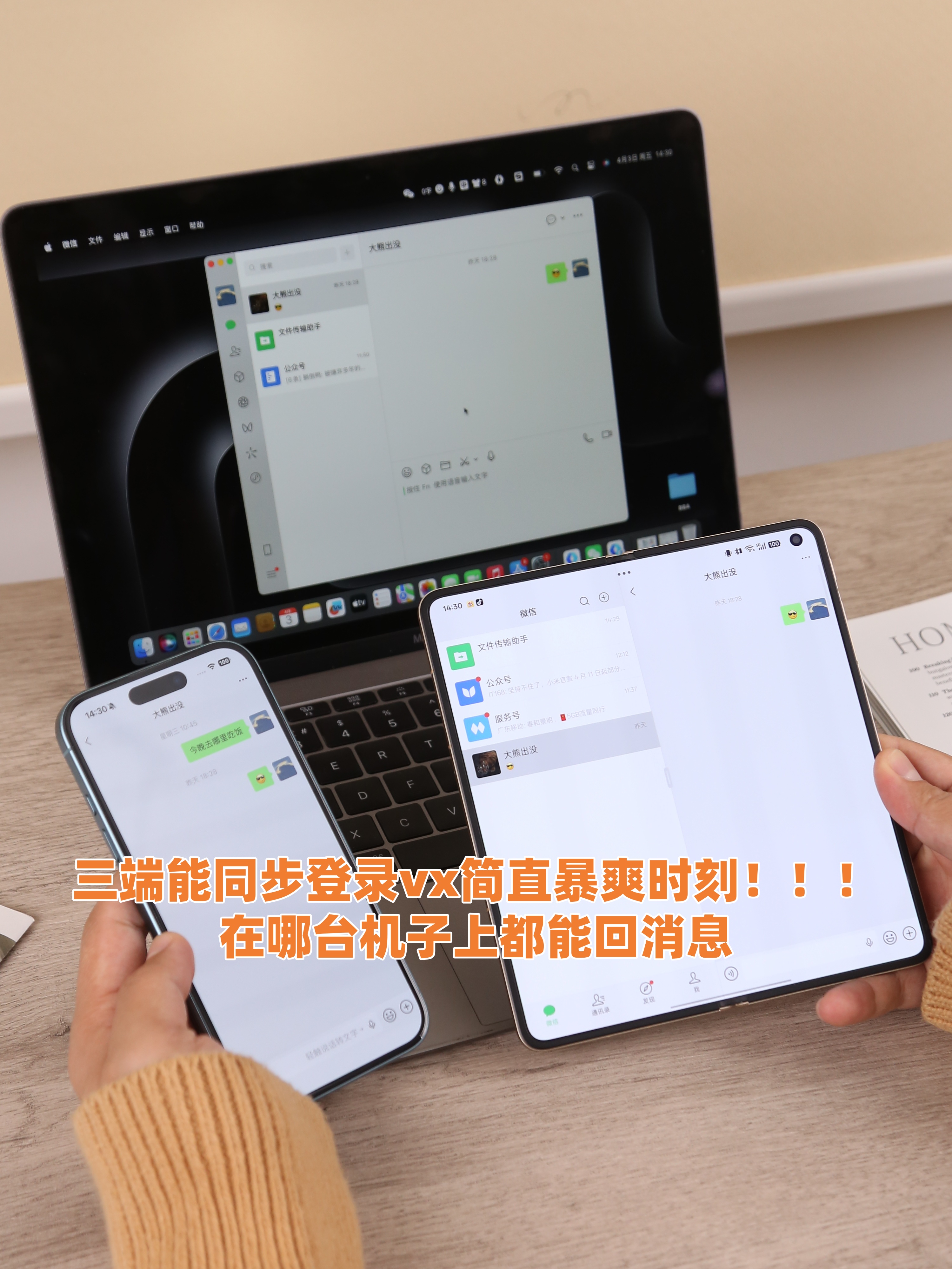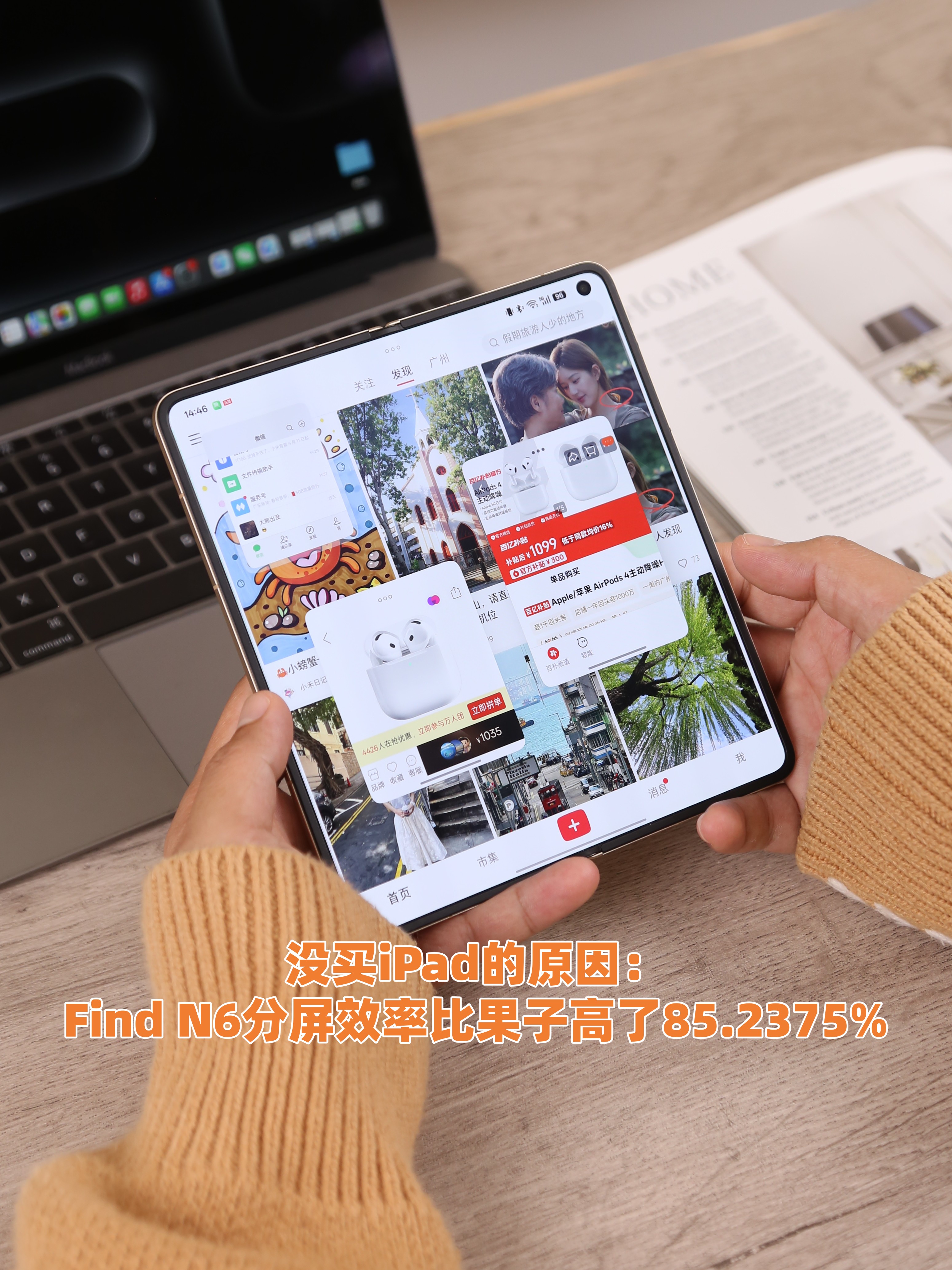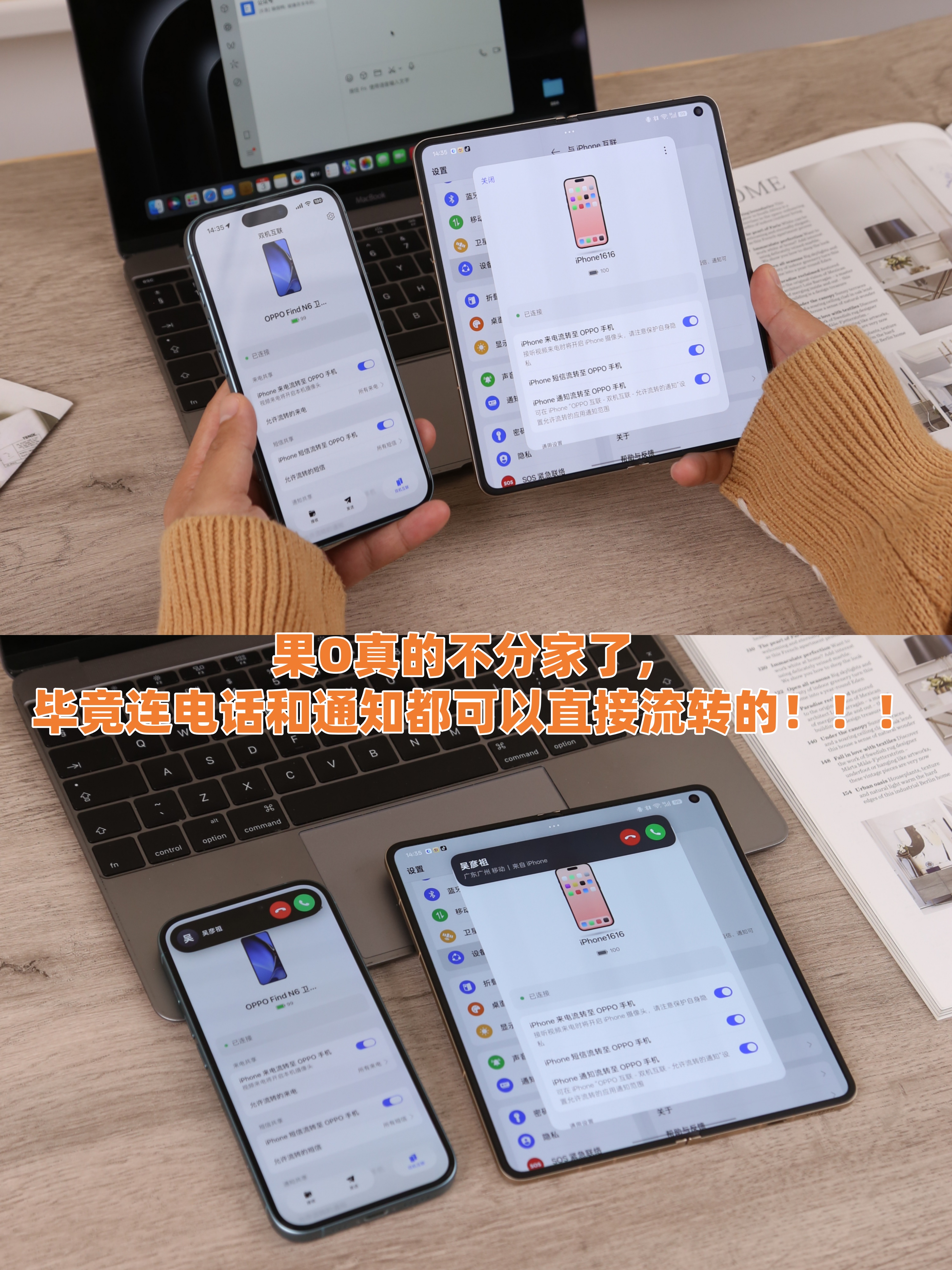 而且最好的是OPPO实现的跟苹果之间的生态互通确实挺彻底~iPhone上的电话通知都能流转,Find N6也可以当作平板设备加上MacBook三端同步登录vx,反正这俩双持基本能搞定工作生活99.9%的需求了,很香!