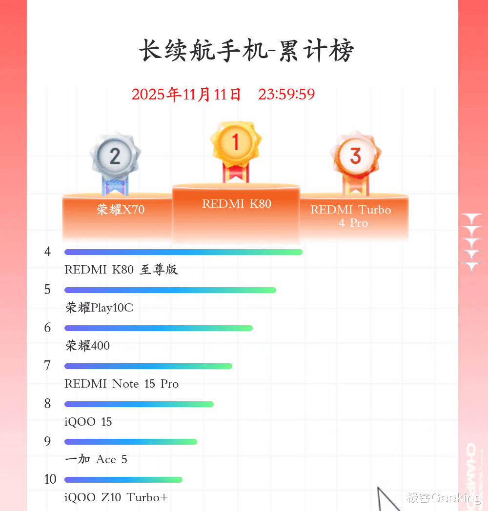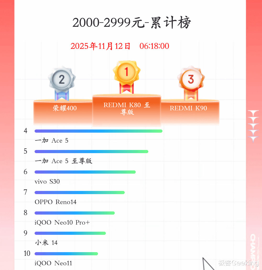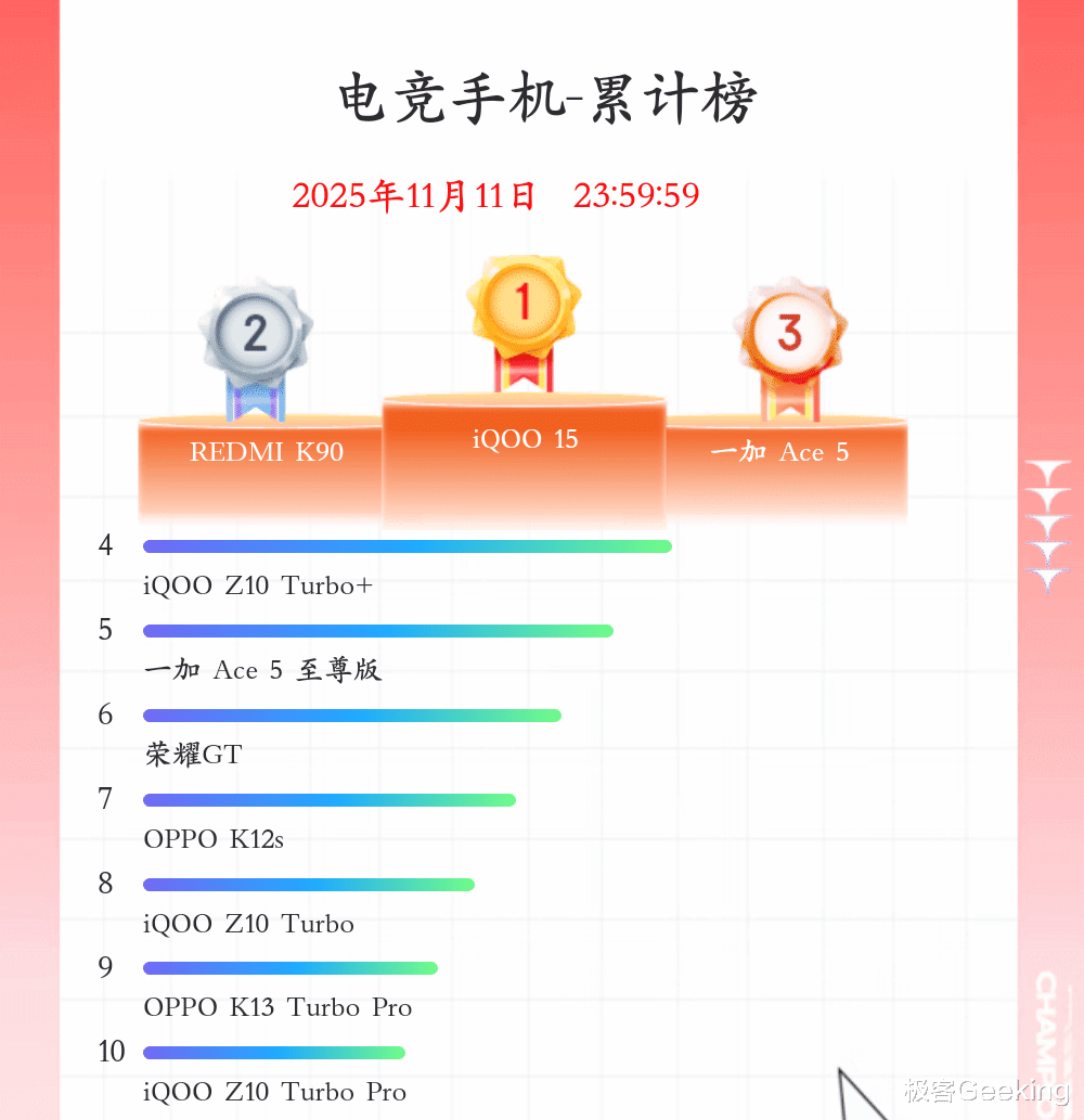 在电竞手机领域,销量前三分别是 iQOO 15、红米K90 和一加Ace 5。