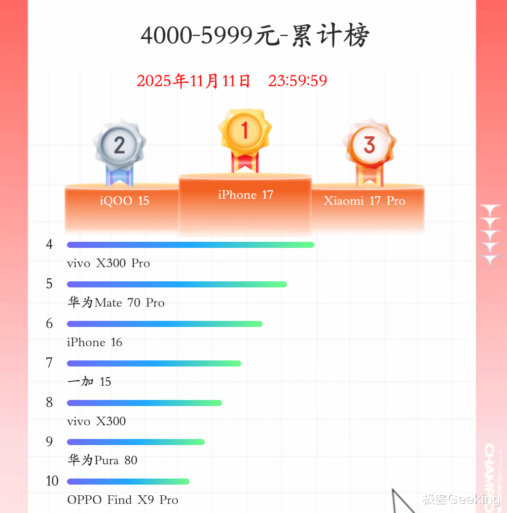 高端手机 4000~5999 元价位段的销量,排名前三依次是 iPhone 17、iQOO 15 和小米17 Pro,值得特别说明的是,今年 iQOO 15 突围进入前三。