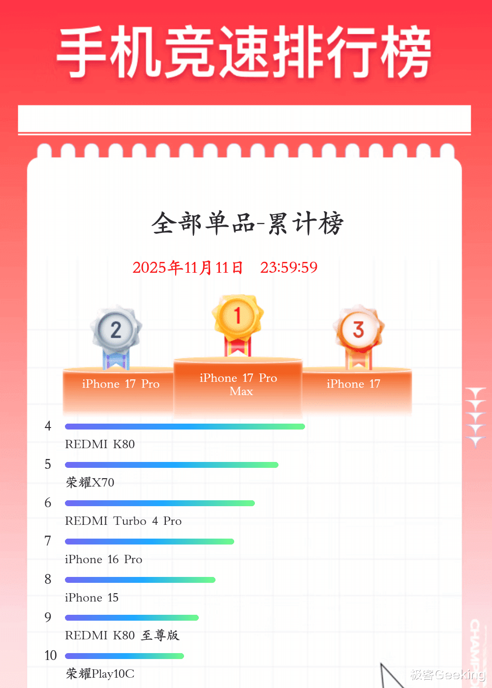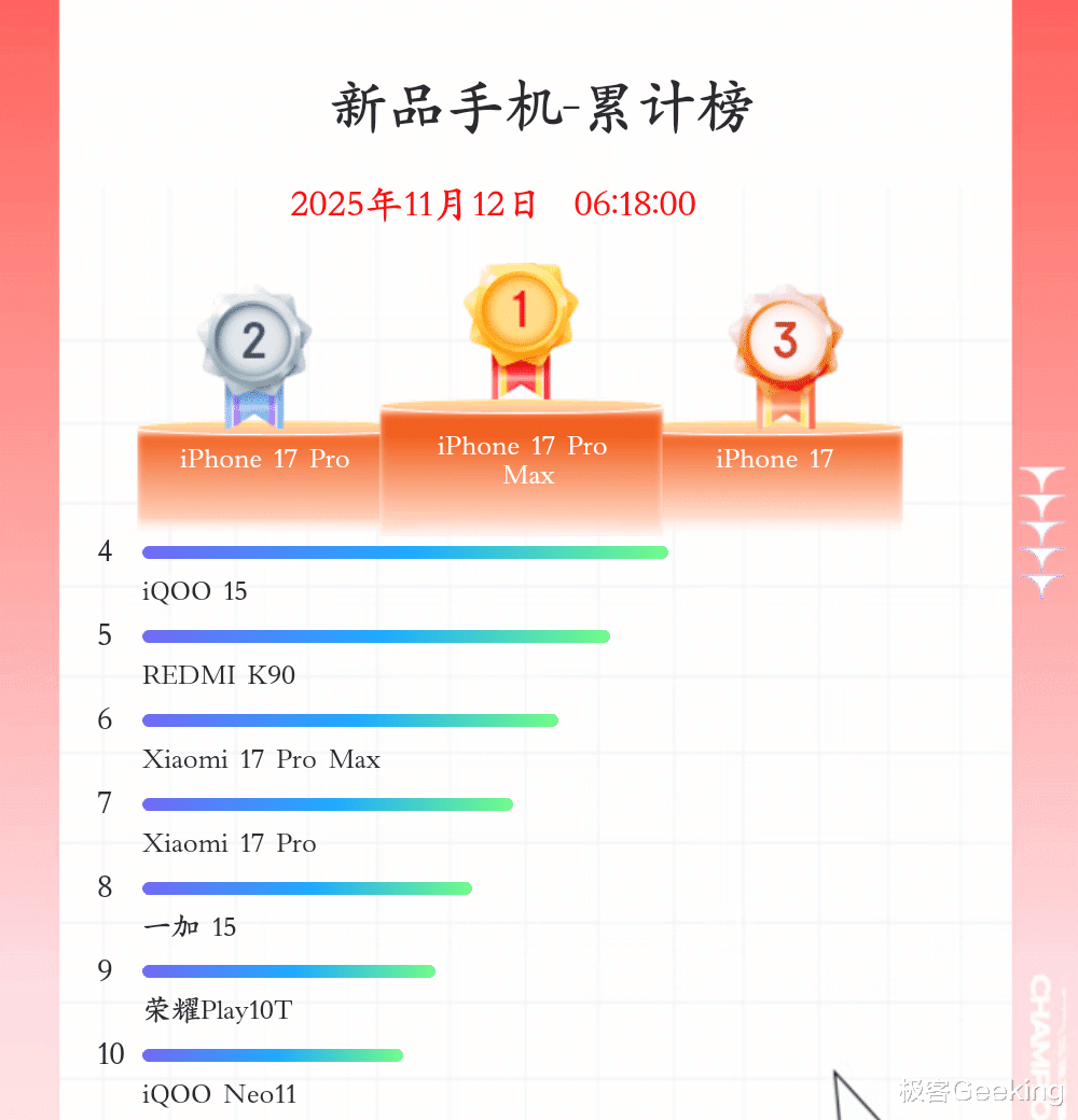 手机单品销量排名不区别价位、品牌和阵营,其表示京东双 11 期间销量最多的手机单品机型 Top10,销量前三分别是 iPhone 17 Pro Max、iPhone 17 Pro 和 iPhone 17,完整 Top10 名单如下: