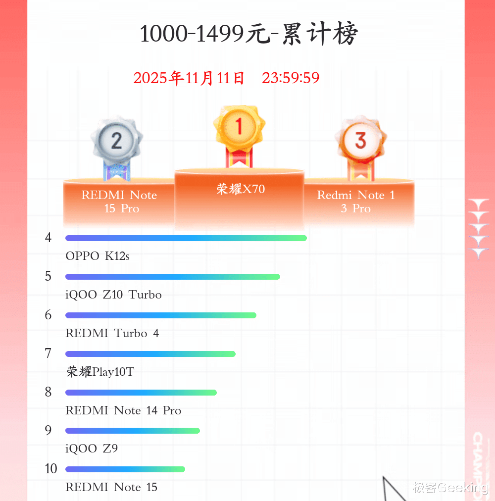 千元机 1000~1499 元价位段手机,销量第一是荣耀X70。