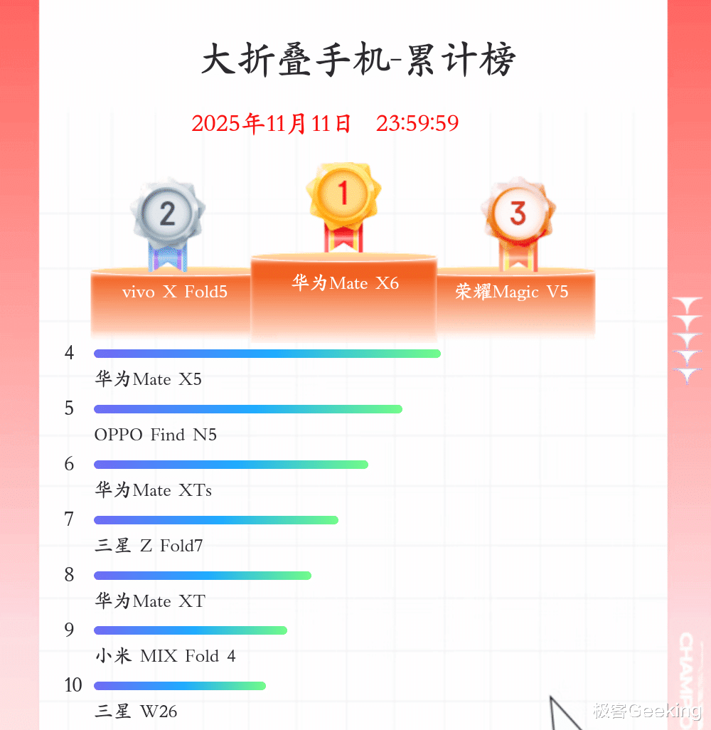 大折叠屏手机,销量前三分别是华为Mate X6、vivo X Fold 5 和荣耀Magic V5。