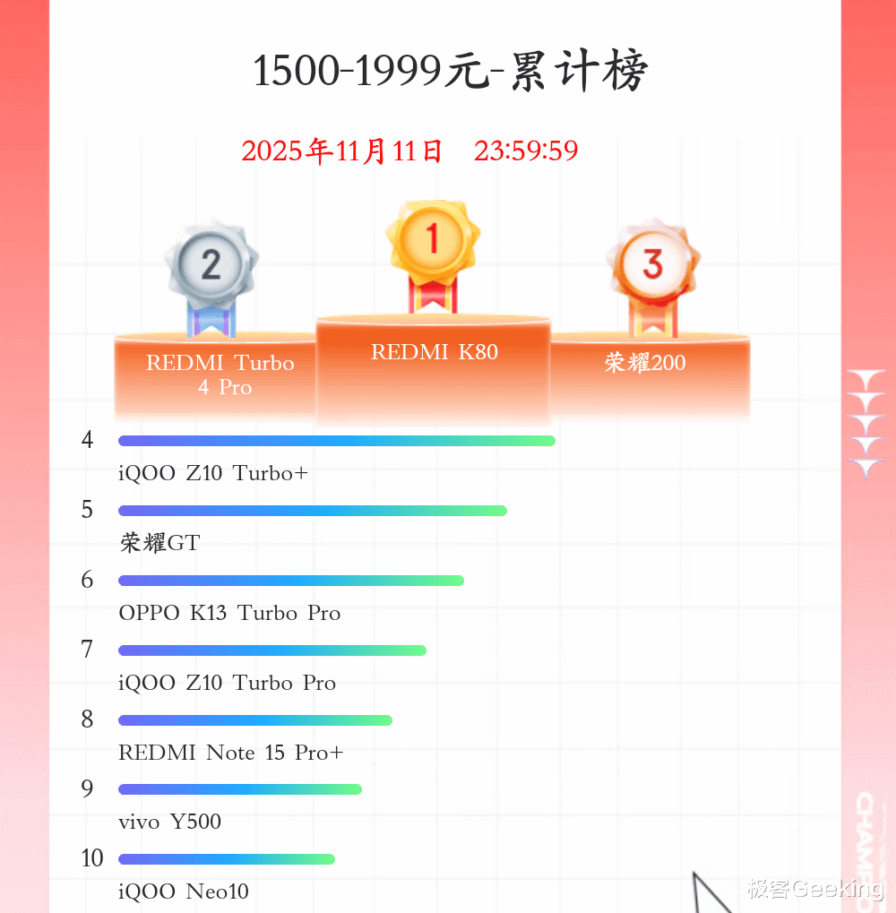 1500~1999 元价位段的手机销量第一是红米K80。