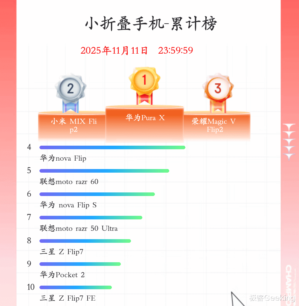 小折叠屏手机,华为、小米和荣耀分别拿下前三。