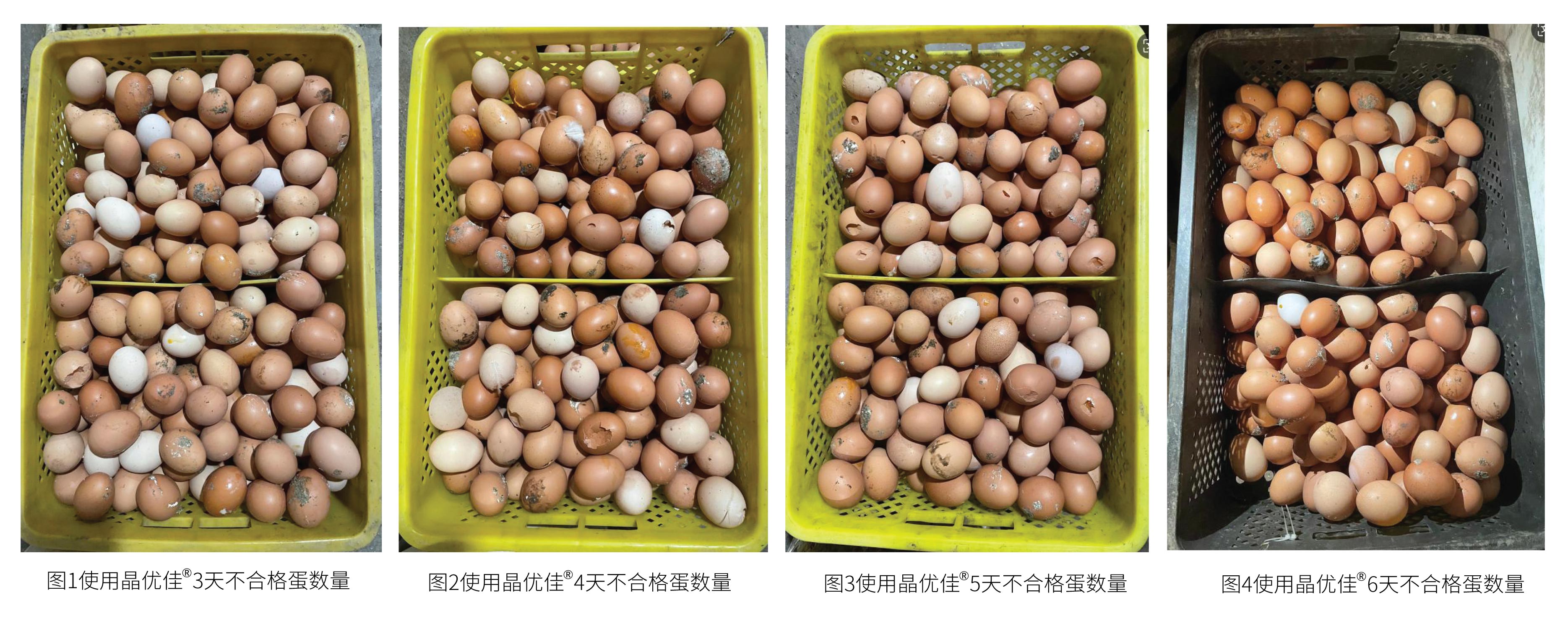 - 不合格蛋大幅减少:使用晶优佳®6天后,破蛋、沙皮蛋、白皮蛋数量明显减少,蛋壳颜色和光泽度显著提高。