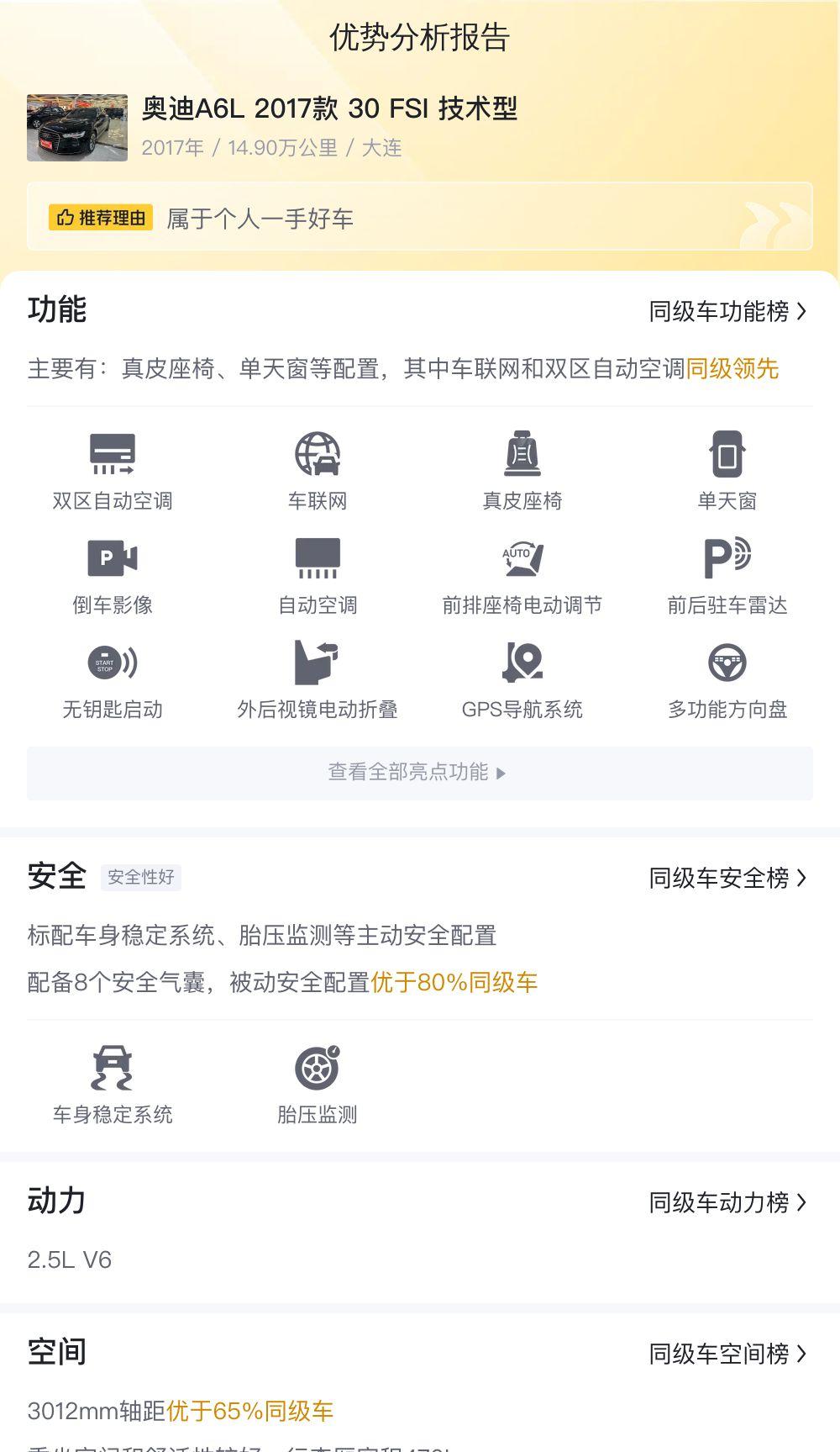 竞品对比:在这个价位,您可以选择的车型其实有很多,比如一些合资品牌的B级车,或者一些自主品牌的C级车。相比之下,A6L的优势在于品牌和空间,劣势在于车龄和里程。