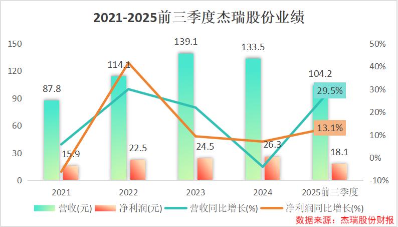2025年前三季度,杰瑞股份实现营收104.2亿元,同比增长29.5%,一改去年营收增速下滑的颓势;净利润达到18.1亿元,同比增长13.1%,增速较2024年提高了6个百分点。