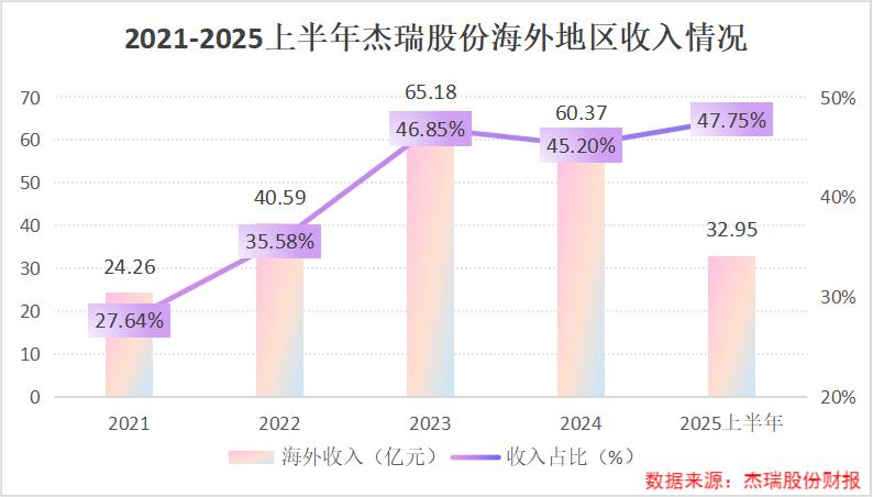 海外地区收入占比从2021年的27.64%提升到2024年的45.20%,2025上半年,海外地区收入占比持续提升,达到47.75%。