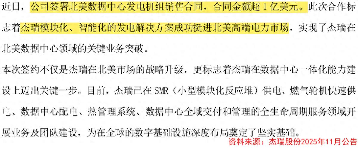 11月21日,杰瑞股份抛出重磅公告,其全资子公司拿下全球AI巨头超1亿美元发电机组订单。
