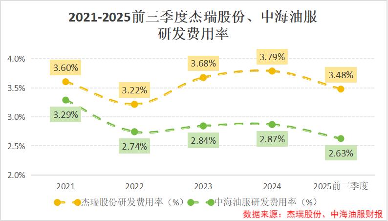 2025年前三季度,杰瑞股份研发费用达到3.62亿元,同比增长13.7%,研发费用率近年来始终维持在3.5%上下,高于同行中海油服约0.8个百分点。