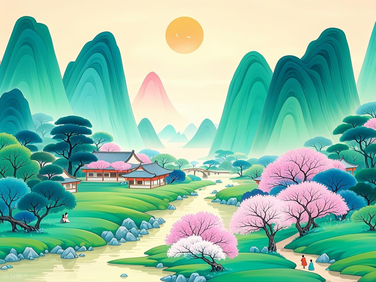 诗中写道,走到南门之外,眼前是山野景色。一场大雨过后,池塘水满溢出护堤。遥望远山,高低错落。池塘里溢出的水分成东西两路向远山方向流淌。原本盛开的桃花、李花,被雨水打落很多,已经有了衰落的迹象。眼看春天就要溜走了,只剩下遍地野草看上去绿油油的。