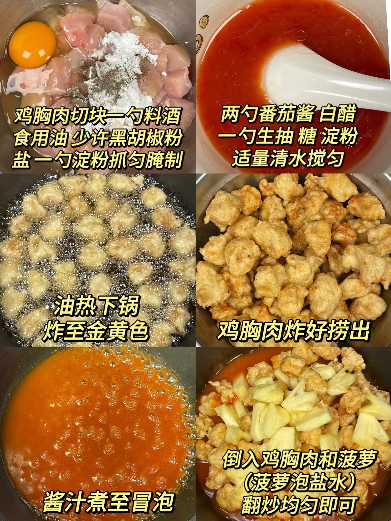 【食材】鸡胸肉 1 块、菠萝 1/4 个、番茄酱 2 勺、白醋 1 勺、生抽 1 勺、白糖 1 勺、淀粉 1 勺、料酒 1 勺、胡椒粉少许、盐少许