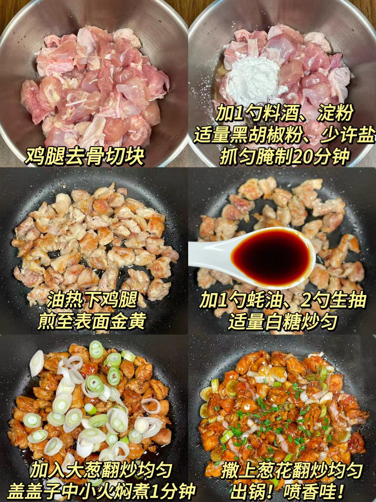 鸡腿去骨切块,加黑胡椒粉、盐、料酒和淀粉抓匀,腌制 20 分钟锁汁入味;大葱切段备用。