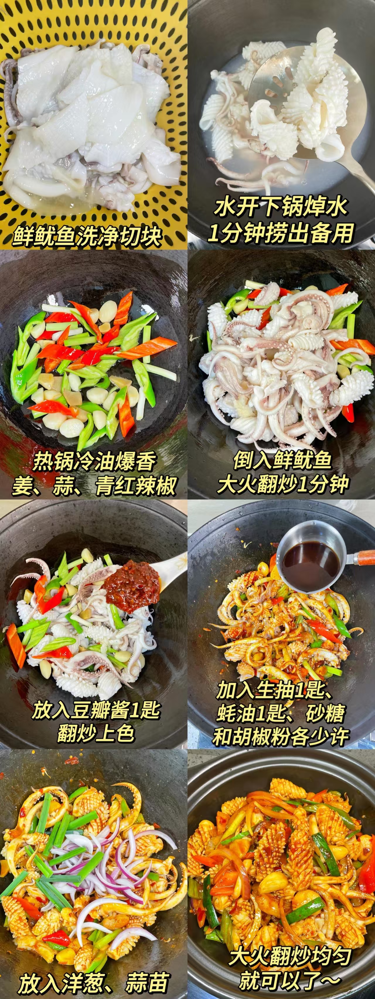 【食材】鲜鱿鱼 1 条、洋葱 1/2 个、青红椒各 1 个、蒜苗 2 根、豆瓣酱 1 勺、生抽 1 勺、蚝油 1 勺、砂糖半勺、胡椒粉少许、姜蒜适量