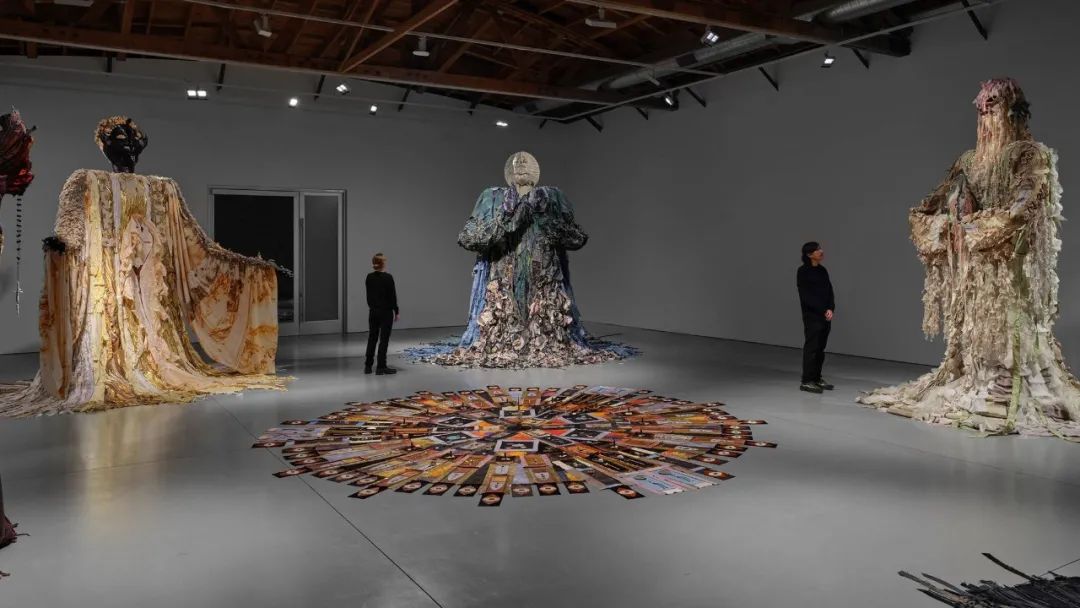 个展“精神层面”展出了五件雕塑,以及一床圆形被子般的装置,均由回收的纺织品和其他现成材料创作而成。