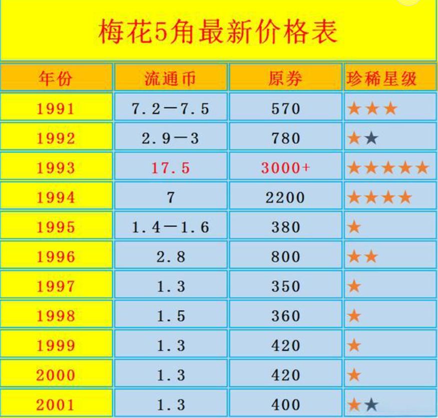 除了1993年版,1991年至1994年发行的梅花5角也备受藏家青睐,价格始终处于高位。其中1991年流通币价格在7.2-7.5元之间,原券可达570元;1994年流通币约7元,原券则高达2200元。而1995年至2001年的版本,流通币价格相对亲民,多在1.3-2.8元之间,但原券依然保持着数百元的收藏价值,成为不少入门藏家的首选。