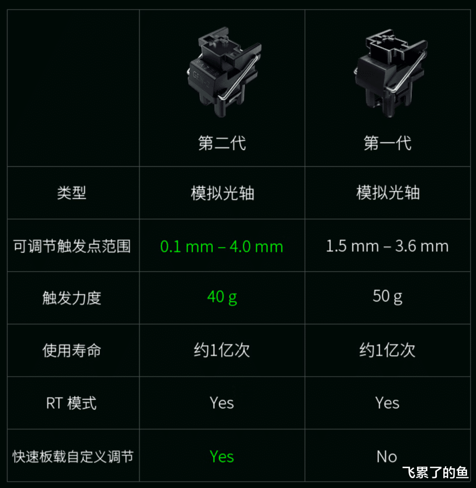 也许有小伙伴会把第二代雷蛇模拟光轴和磁轴做对比,原理上,雷蛇的模拟光轴是用光,通过红外光束的变化检测按键的触发和释放,磁轴是通过磁场,既轴体的磁铁和霍尔传感器的距离变化来检测触发、释放。