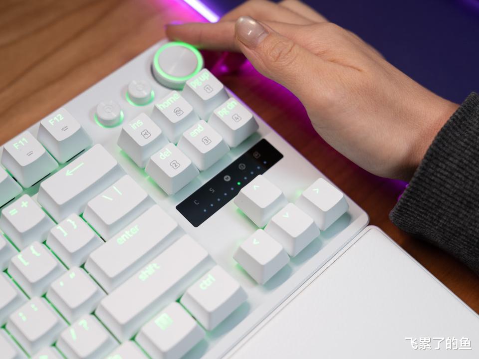 右侧中间位置的色的屏幕,一方面有点撞色效果,让键盘配色不会过于单一;另一方面,图标式的状态、模式显示更加醒目直观。而且屏幕下方还有一排LED指示灯用以显示按键的行程,也能用来快速调节触发范围,总之,这块屏幕虽小,但实用性还是很强的。