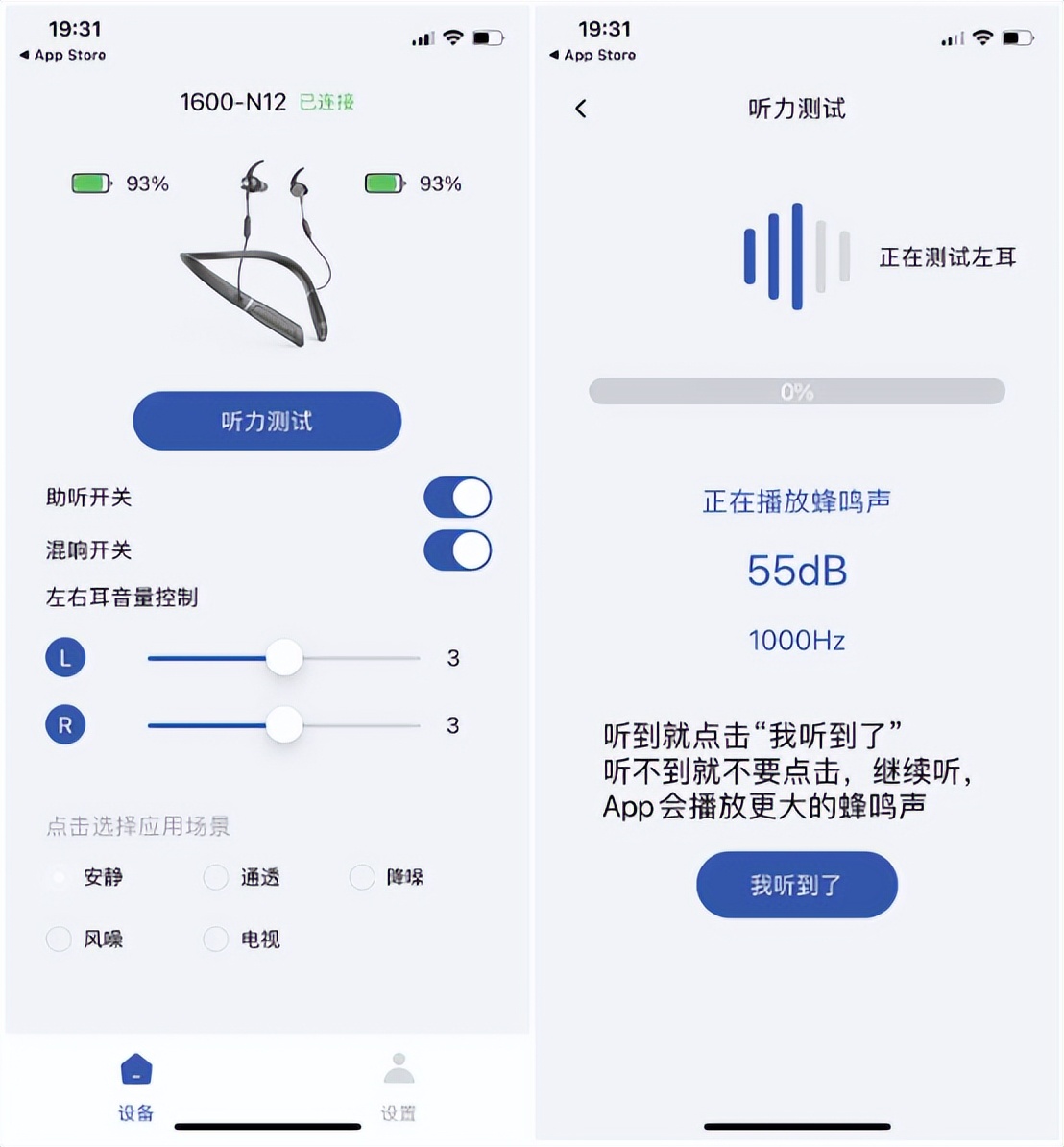 值得一提的是,町石tinx挂脖助听器还配备了专属APP,通过APP端不仅可以进行听力测试,不用跑医院在家就可以完成听力测试。还可以根据不同场景设置专属模式,比如看电视可以设置电视模式,户外可以设置通透模式等等,非常方便。