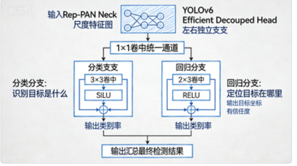 ▲ Efficient Decoupled Head 结构示意图,展示分类分支与回归分支的独立卷积层设计,标注任务分离功能。