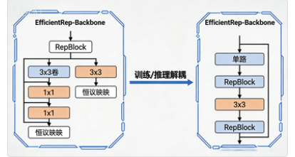 ▲ 展示 RepBlock 模块的训练与推理状态对比,左侧多分支训练结构,右侧单路推理结构