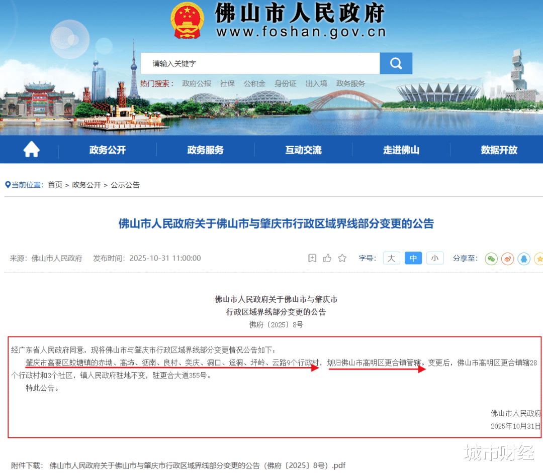 佛山市10月31日发布《关于佛山市与肇庆市行政区域界线部分变更的公告》: