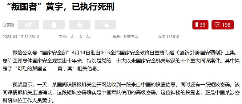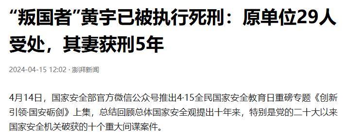 2016年5月,黄宇因间谍罪被依法执行死刑,他的妻子也因参与泄密被判5年有期徒刑,最终落得家破人亡的下场。