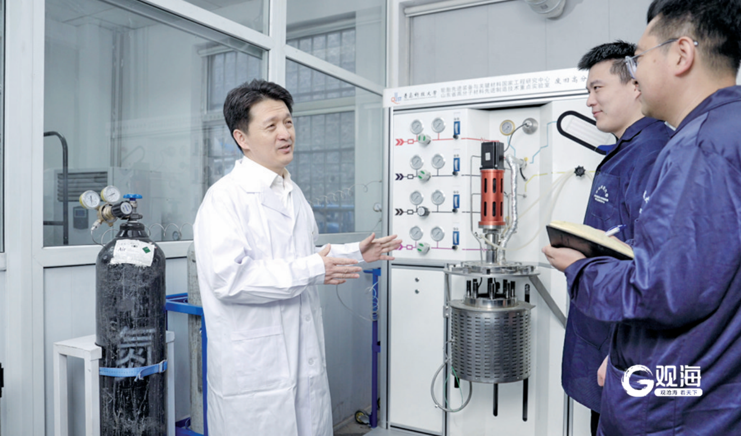青岛科技大学的吴明铂教授(左一)指导学生做实验。
