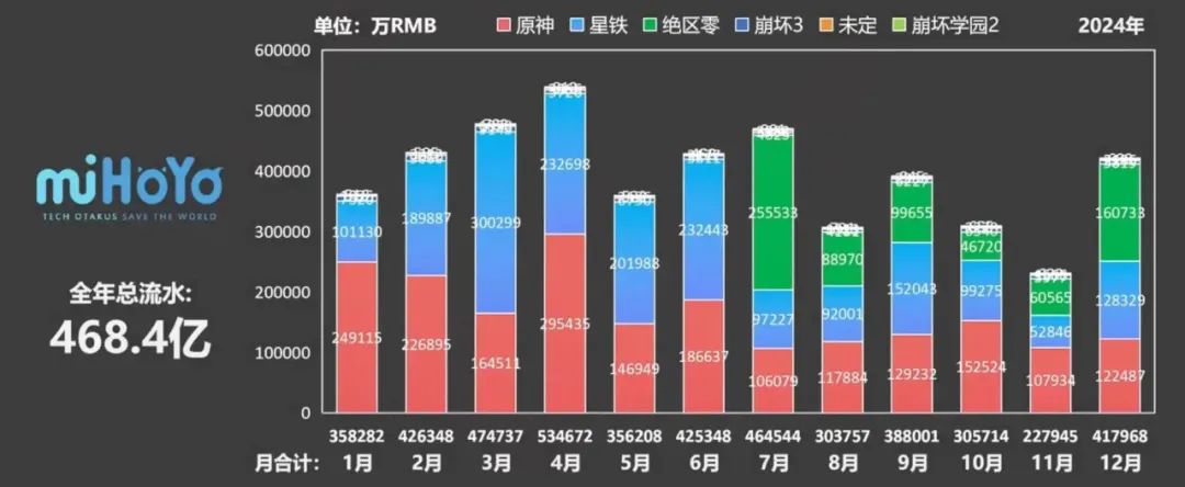 起因是部分游戏站点,为了迎合话题,避免冲锋,对国内二游在去年(2024)年的流水数值进行预估。本是件稀疏寻常的事,但为博眼球给米游的年度总流水给了个超高的倍数,算上国内外,一整年的预估到近470亿。