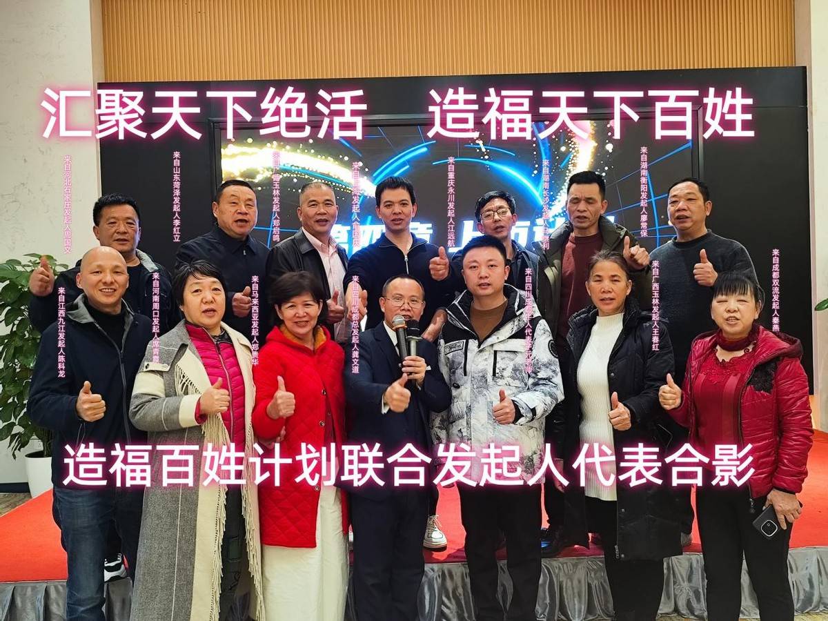 3月8日,项目发起仪式在成都温江铂雅名人酒店举行。来自多地的12位线下联合发起人共同参与启动环节,分别为:江西九江造福百姓计划发起人陈科龙,湖南长沙造福百姓计划发起人马继利,湖南衡阳造福百姓计划发起人廖常保,河南周口造福百姓计划发起人席青霞,马来西亚造福百姓计划发起人郑贵华(符桂娘)与邹彩华,山东菏泽造福百姓计划发起人李红立,成都双流造福百姓计划发起人秦燕,河北石家庄造福百姓计划发起人周国文,河北邯郸造福百姓计划发起人王翠霞,广西玉林造福百姓计划发起人郑启鸣,重庆永川造福百姓计划发起人江远航,上海造福百姓计划发起人俞国庆。
