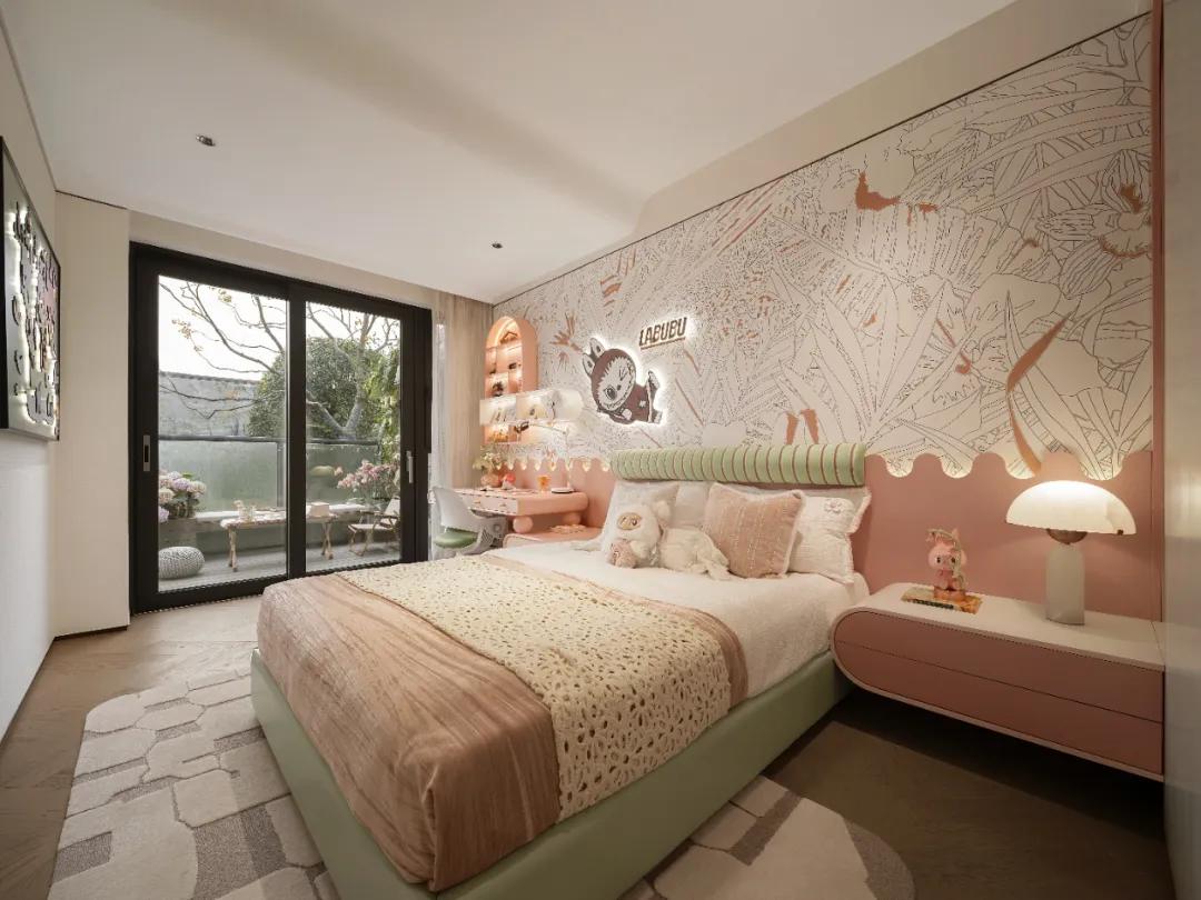 儿童房以Labubu-莫可可精灵为灵感,将奇幻、童趣与艺术融入空间每个角落。卧室整合了休憩、学习、玩耍与收纳等多重需求,并借由南向露台的延伸,为亲子互动与自然探索,提供无限可能。