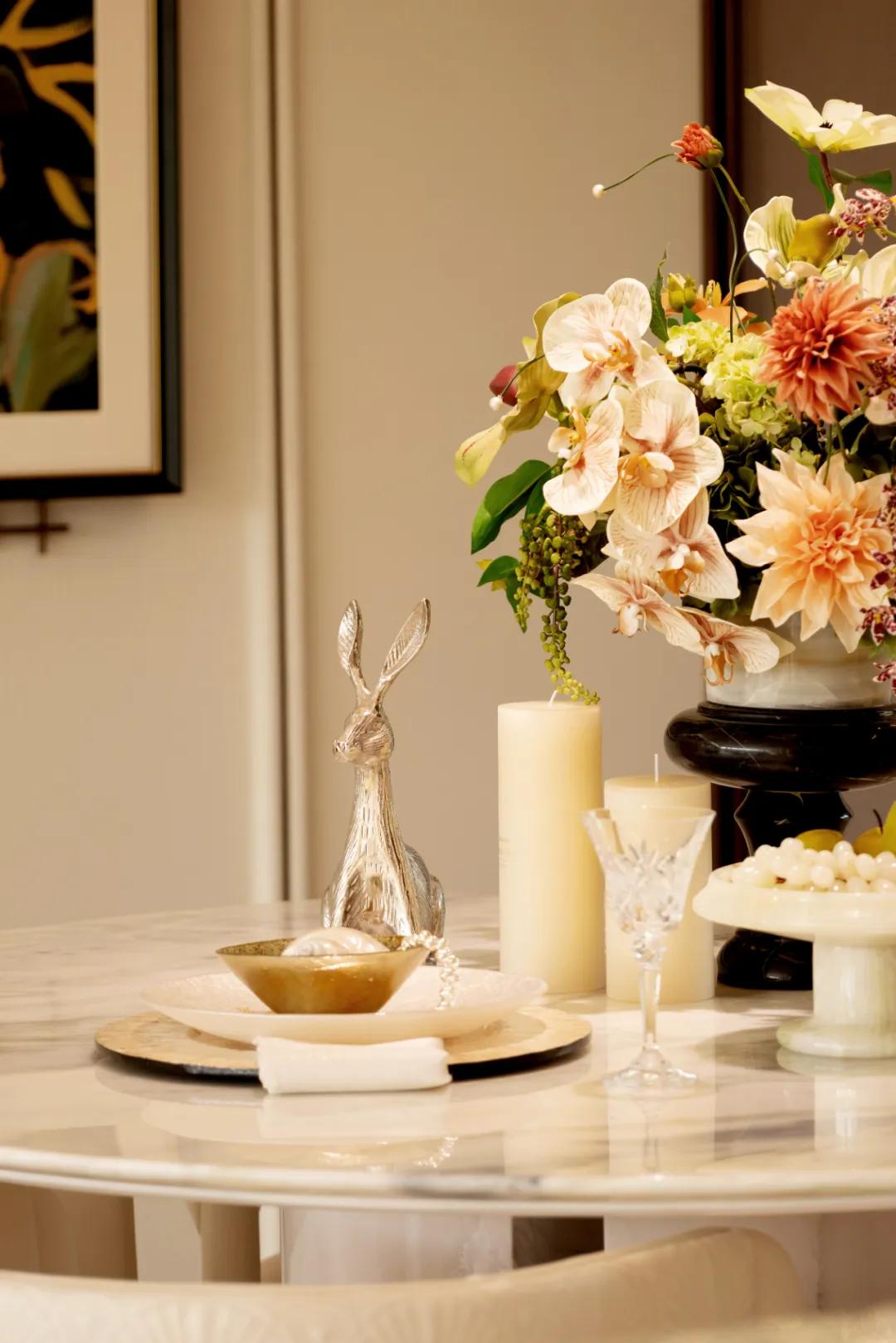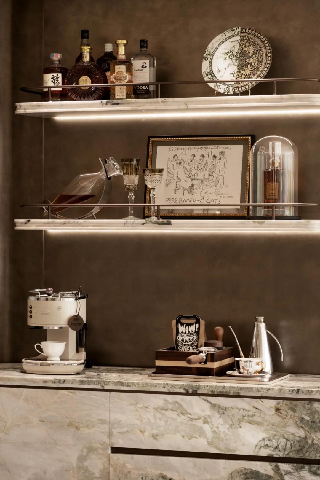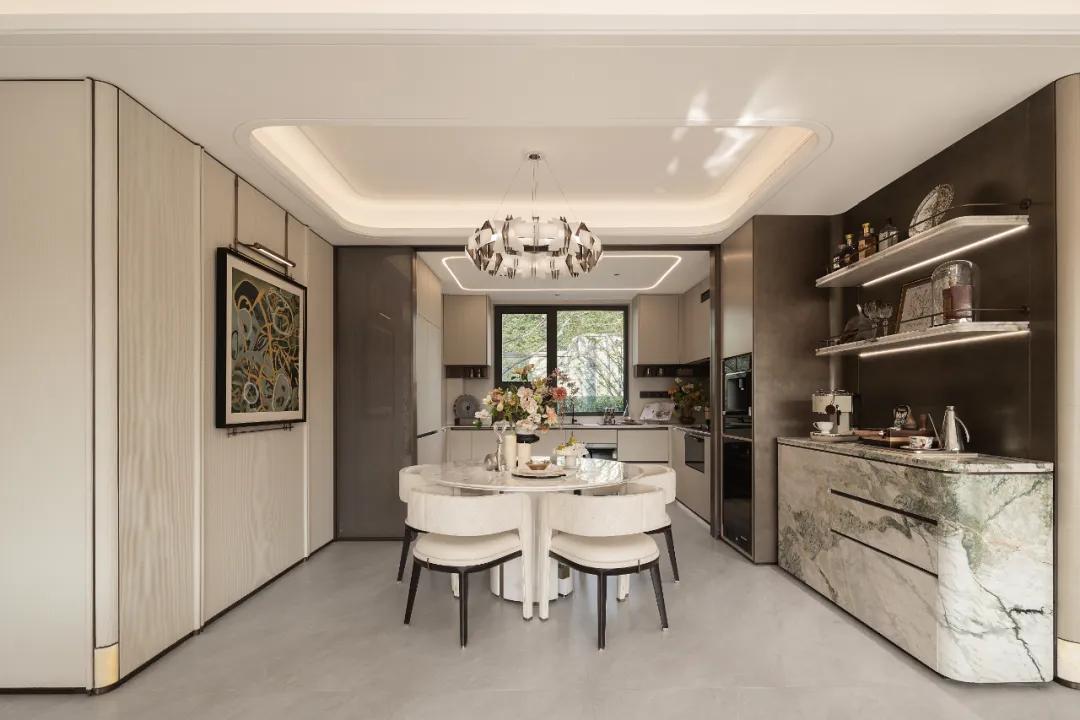 餐厅以细节承载生活的质感,一桌五椅围合出亲密的尺度,云石吊灯洒下温柔光晕,与墙上艺术挂画,共织充满仪式感的光影宴席。石材与金属的碰撞,与客厅的细节遥相唱和,让空间的韵律自然流动。餐边柜是生活情调的延伸,让清晨咖啡的醇香与夜晚美酒的微醺,成为生活最动人的时光。