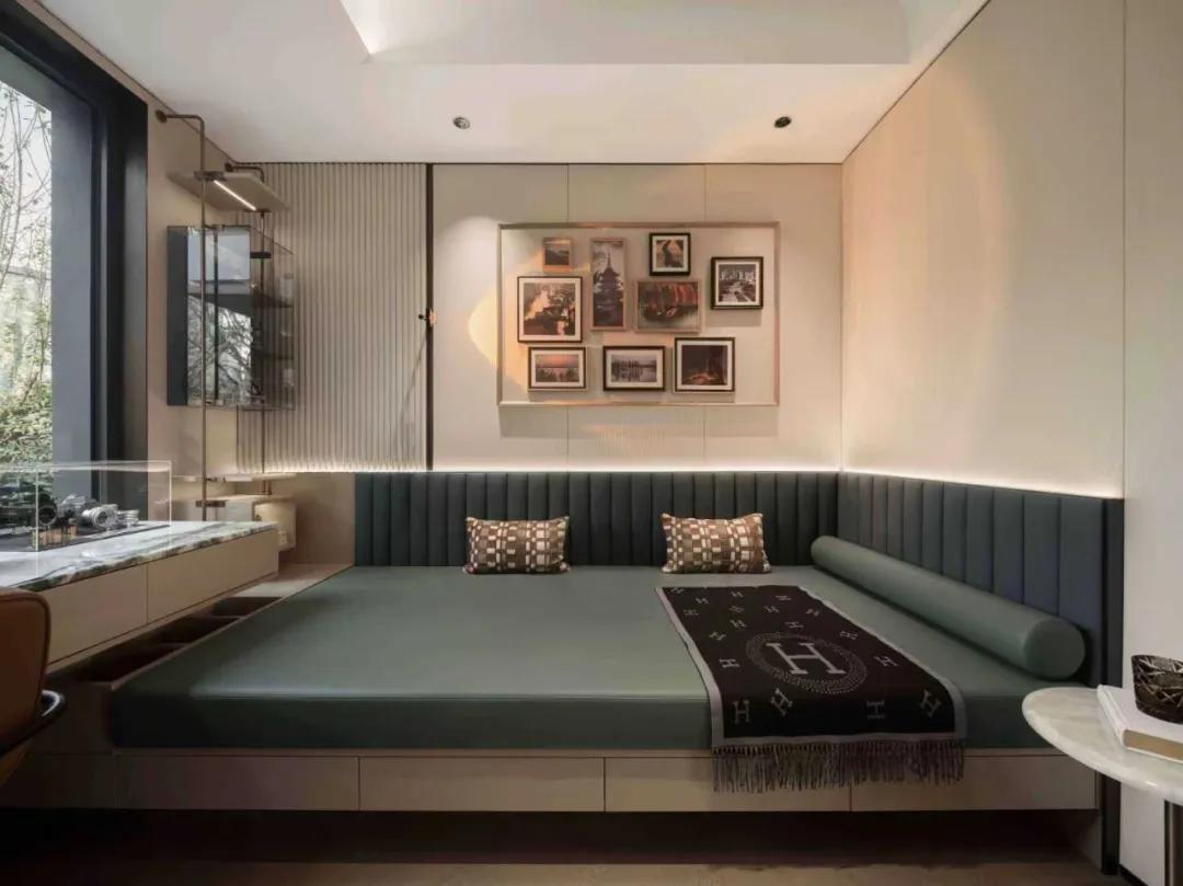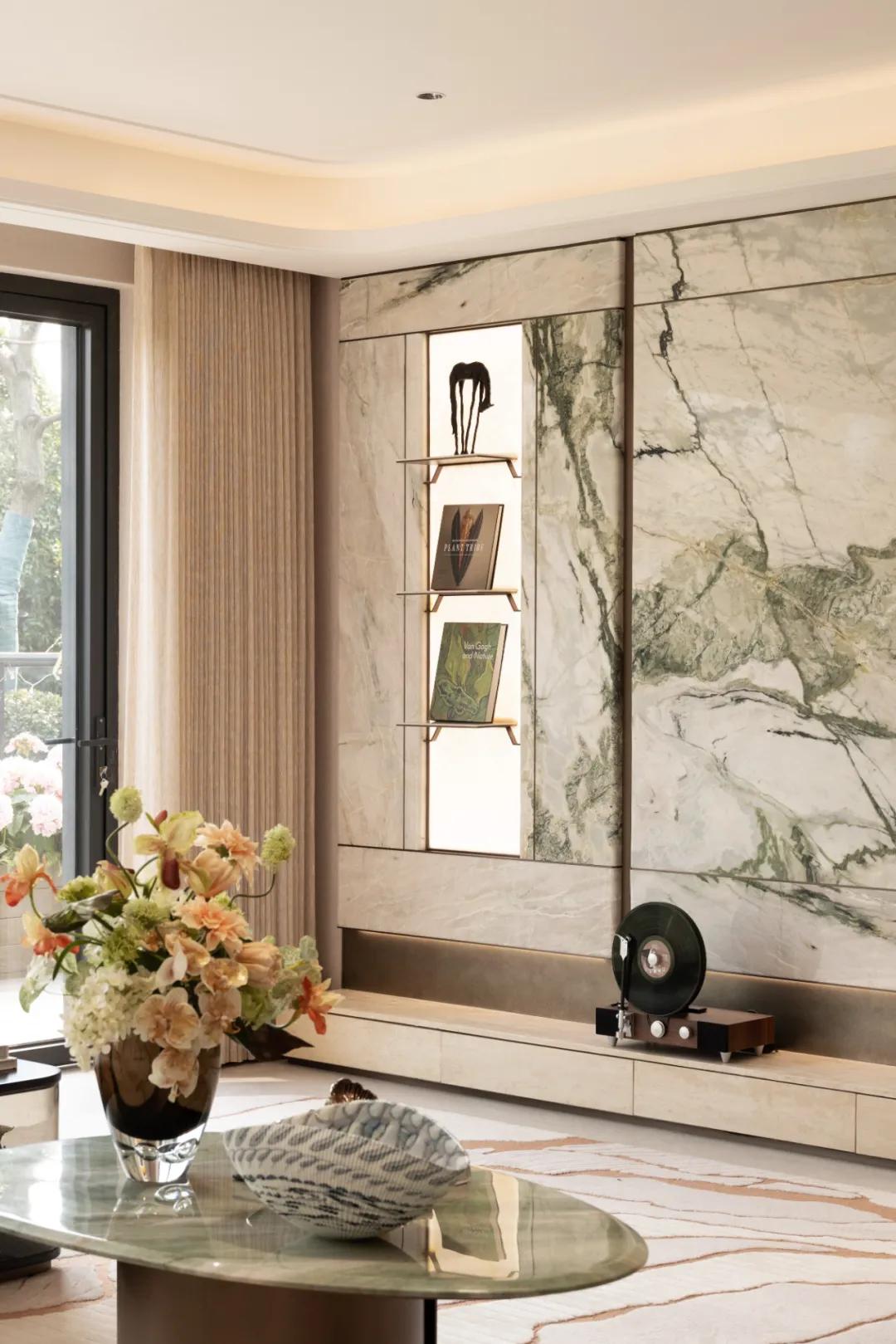 设计以范思哲卡拉卡塔绿大理石作背景墙,奢石的自然纹理成为空间视觉焦点,奠定沉稳而高雅的基调。空间整体色调温馨素雅,在米色的基底上,局部点缀棕色与绿色,营造舒缓而富有生机的氛围。