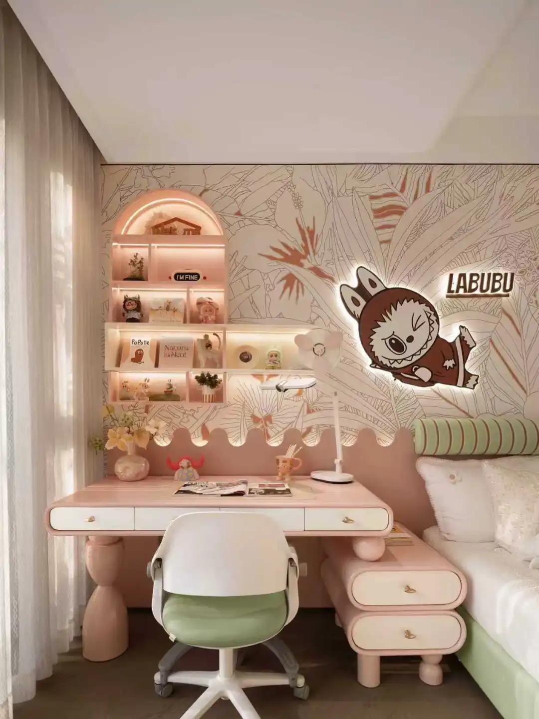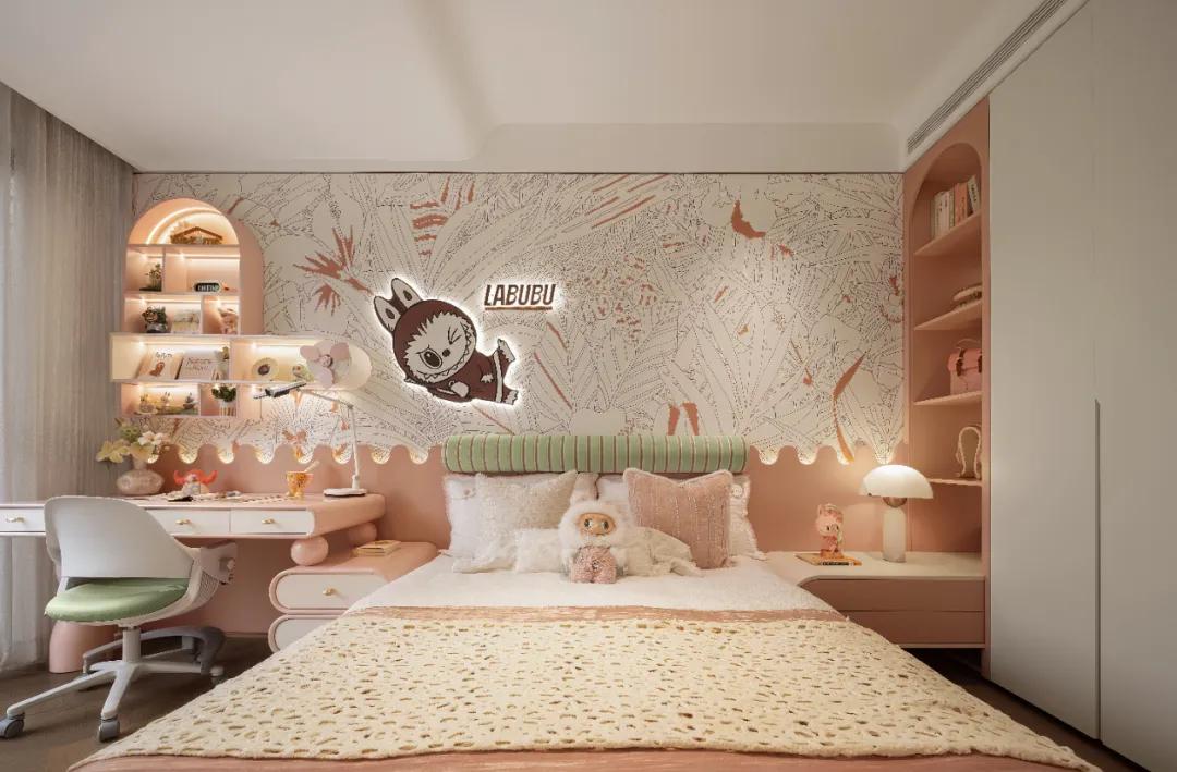童话,从床头一片森林秘境的绘画中悄然开始。柔和的色彩包裹着整个房间,流动的弧形元素,消解了空间的棱角,引导想象自由伸展。床品、饰品以及趣味造型的发光挂画,皆是莫可可精灵的身影,将守护孩子的梦境,陪伴孩子度过每一个轻盈且童趣的日常。