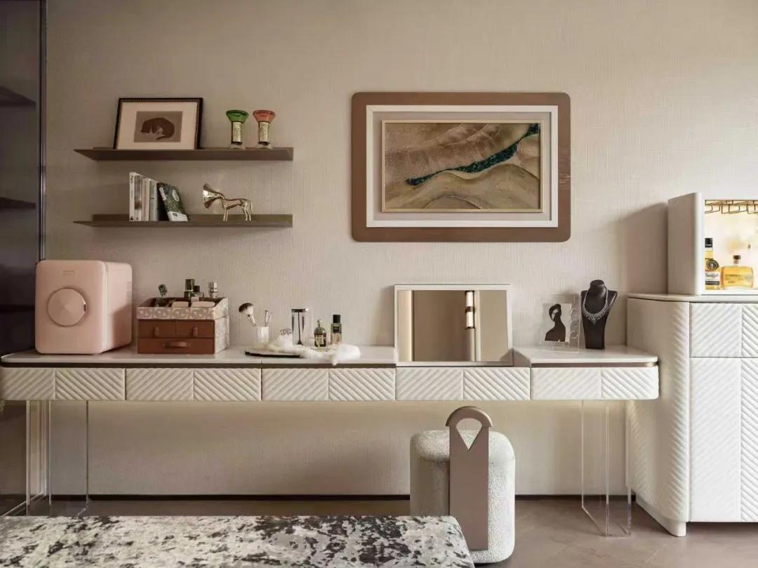 床尾区域规划储物与化妆空间,梳妆台与酒柜组合,提供女主人晨起梳妆、夜晚小酌的私享天地。丝绒梳妆凳、粉色美妆冰箱、精致的护肤品以及内嵌水晶原石挂画等,细节中诉说女主对品质生活的追求。