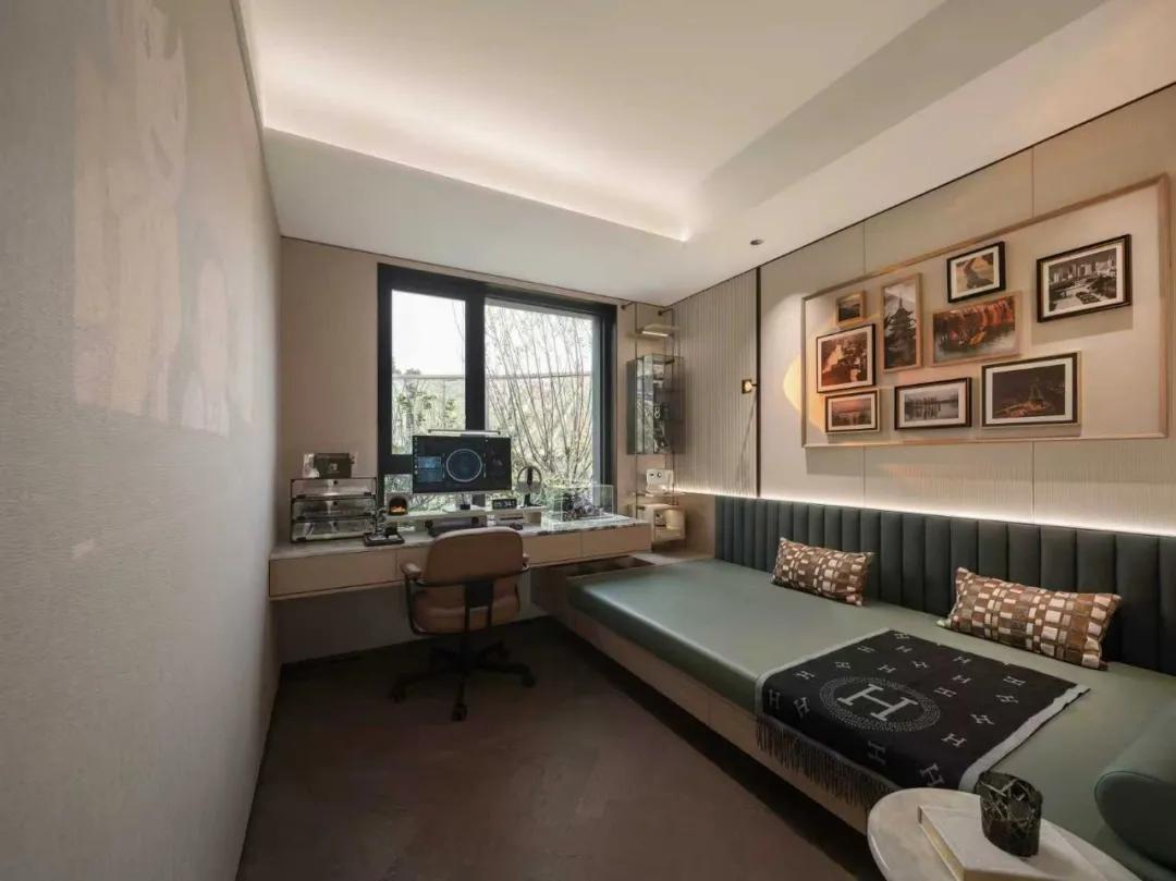 书房,是精神的栖息地,亦是时光的收藏馆。男主于此沉思创作,用镜头捕捉家人成长的轨迹,将每一份被珍视的瞬间,定格为墙上的叙事。空间的智慧,在于场景的无缝切换:当投影仪开启,这里是共享光影的家庭影院;当沙发床铺开,则又化身为安放亲情的客房。