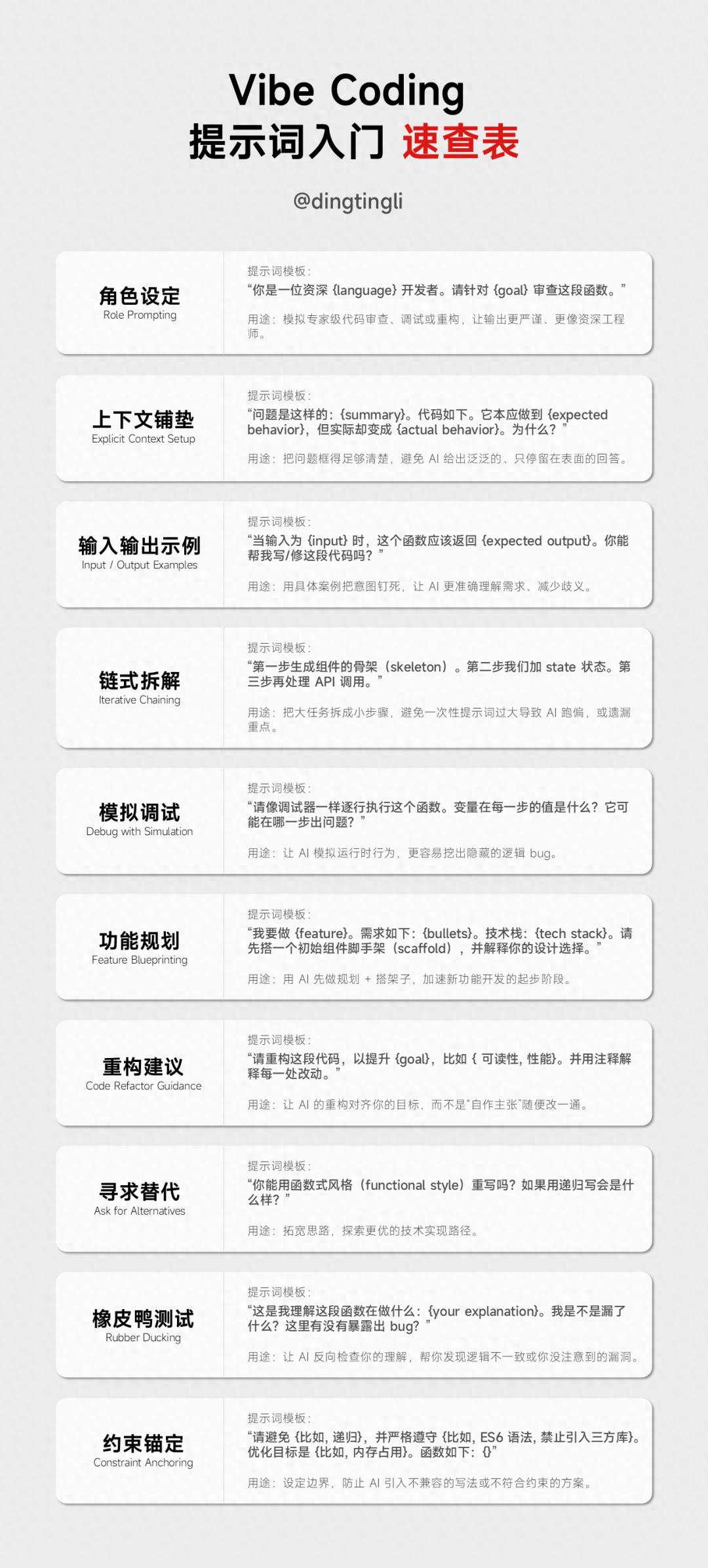 在进入新功能实战前,为了方便你随时复习,特意整理了一份《Vibe Coding 提示词入门速查表》。建议收藏保存,写 Prompt 卡壳时随时翻看: