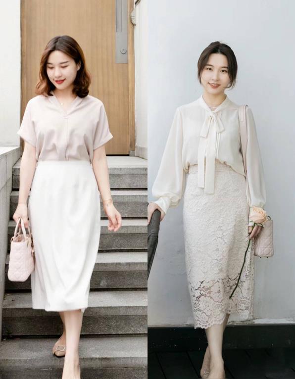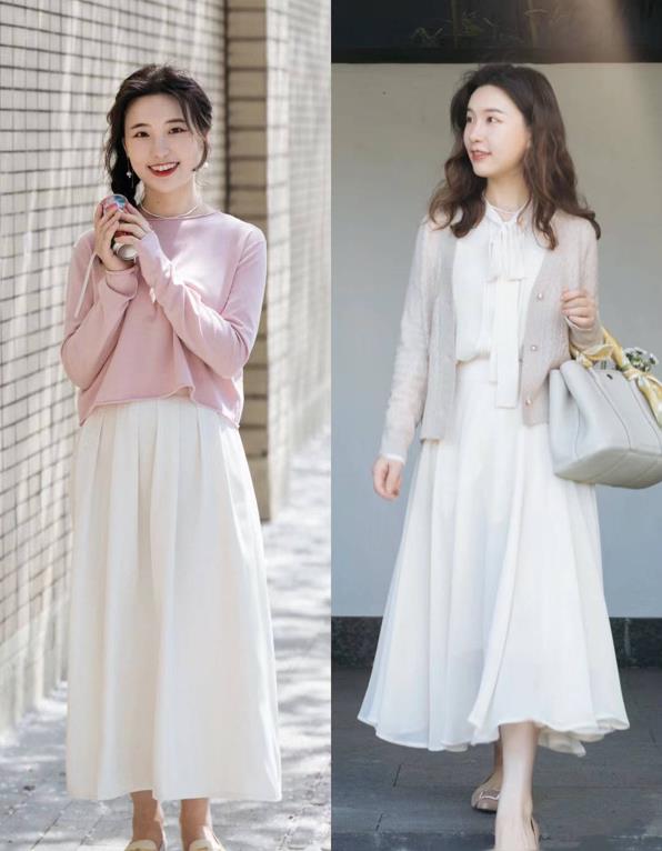 解析二:色彩呼应,浅色上衣+浅色过膝裙显高显瘦