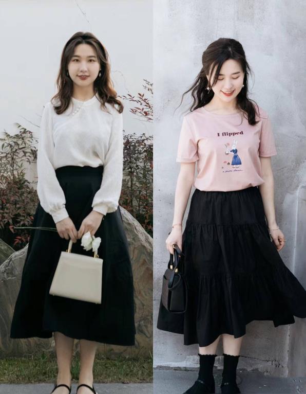 当我们在选择过膝裙的时候,也要考虑身材比例的问题,比如很多人认为小个子不需要穿长裙,但穿长裙不一定是劣势, 只要你能够选择对的款式,那么长裙也能够展现出你的优势。比如如果你的臀部不够翘,腰不够细,胯宽可以试试这种A字型的过膝裙,通过这种宽松的裙摆来掩盖胯宽的问题,并且扬长避短。
