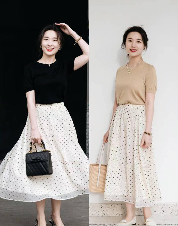 解析一:选择同色系的上衣,与过膝裙呼应更显高级