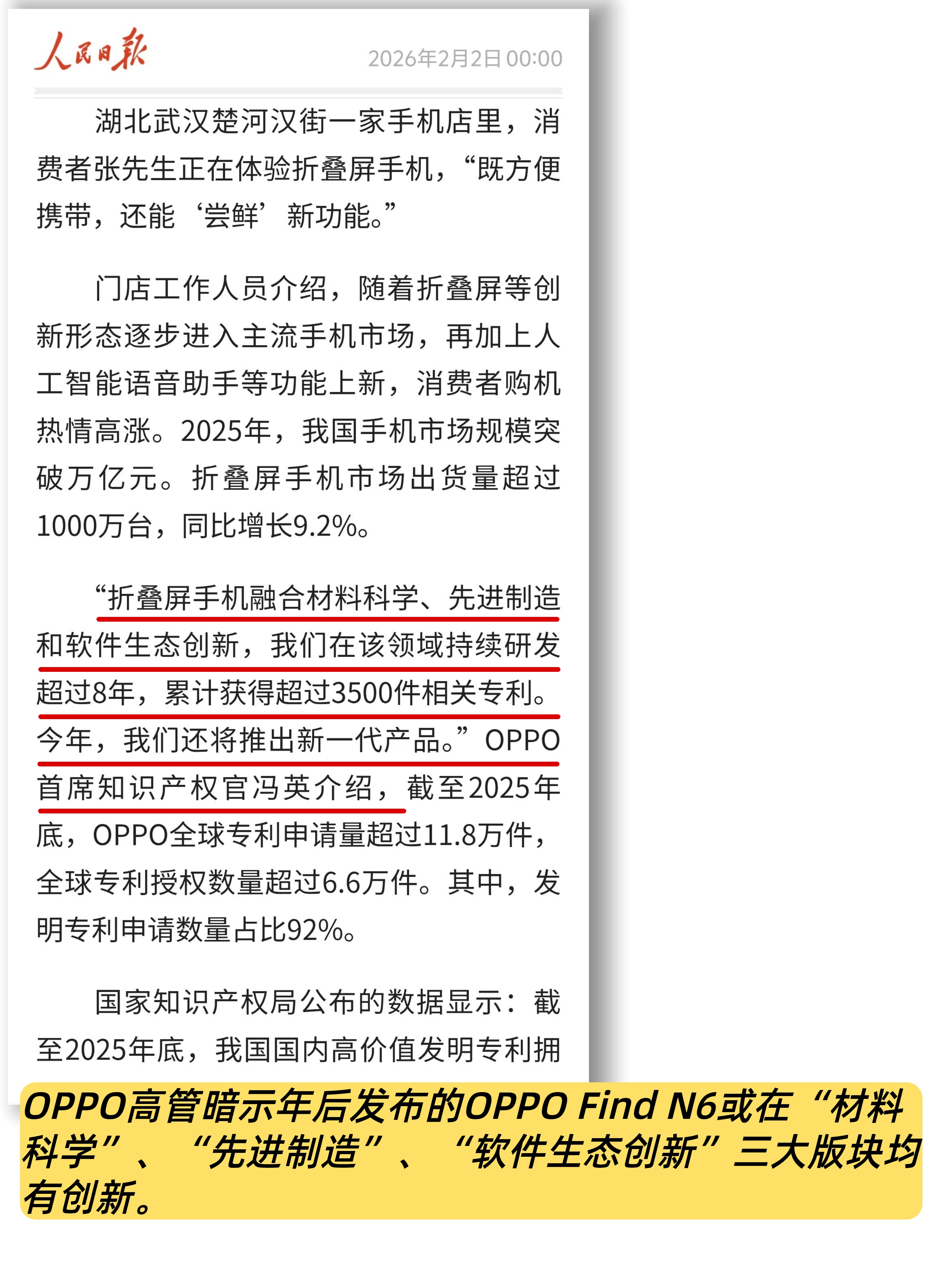 在最近接受人民日报采访时,OPPO高管透露:“折叠屏手机融合材料科学、先进制造和软件生态创新,我们在该领域持续研发超过8年,累计获得超过3500件相关专利。今年,我们还将推出新一代产品。”