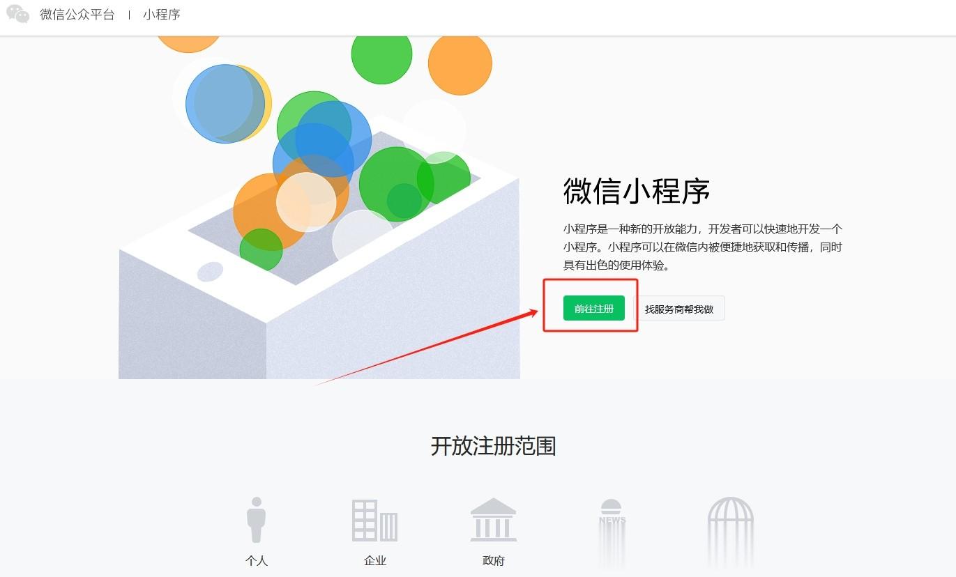 - 打开[微信公众平台],点击“立即注册”,选择“小程序”类型;