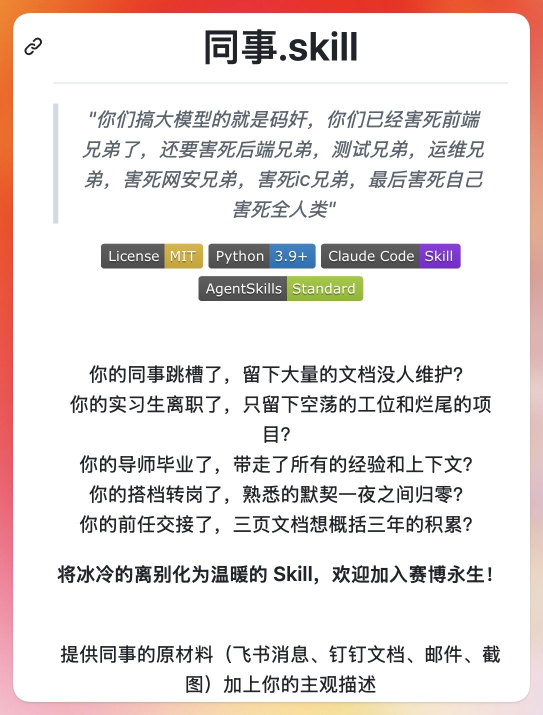 同事.skill在GitHub的README里有一行不起眼的小字:“原材料质量决定skill质量:聊天记录+长文档>仅手动描述。建议优先收集:他主动写的长文>决策类回复>日常消息。”