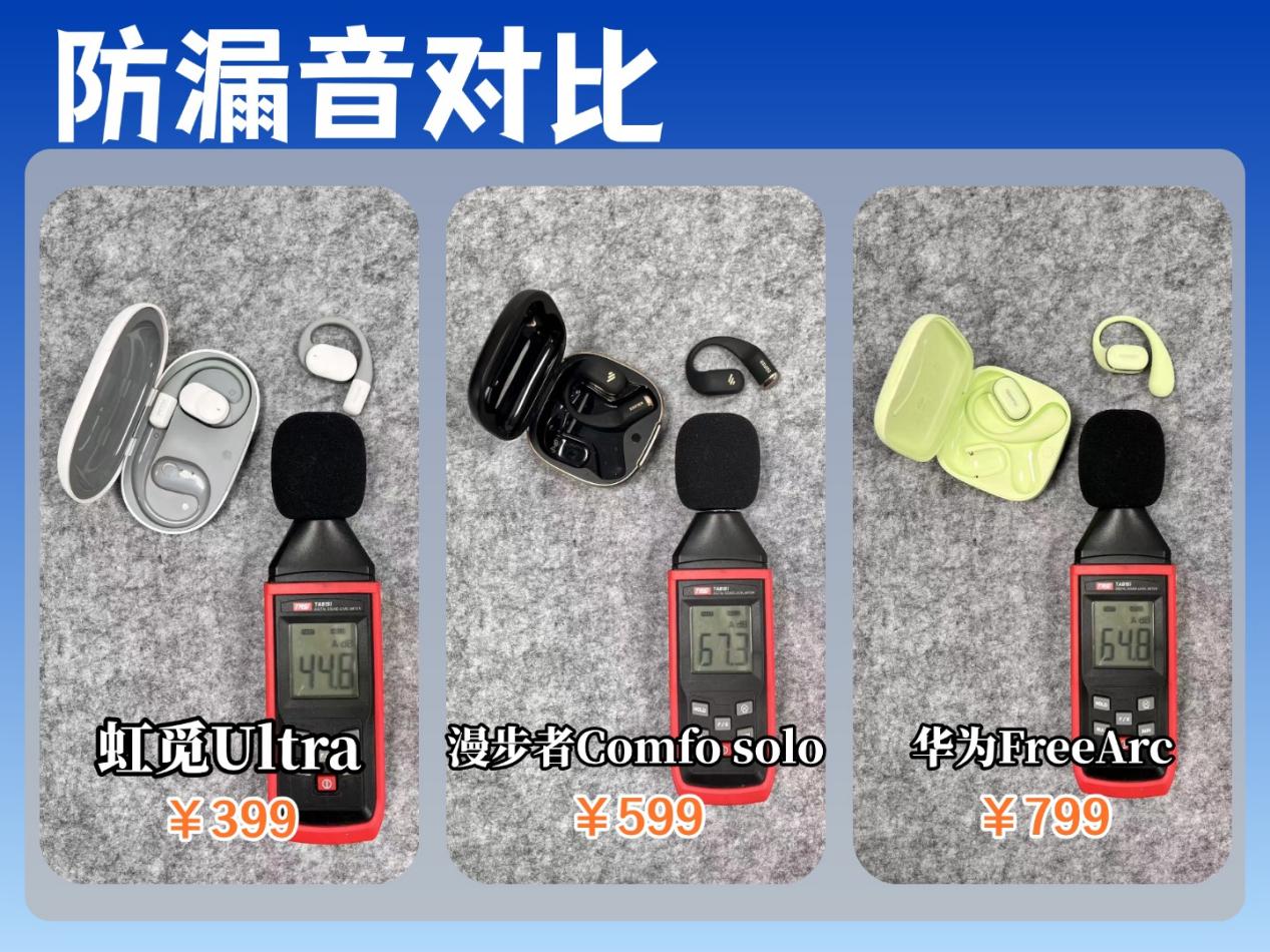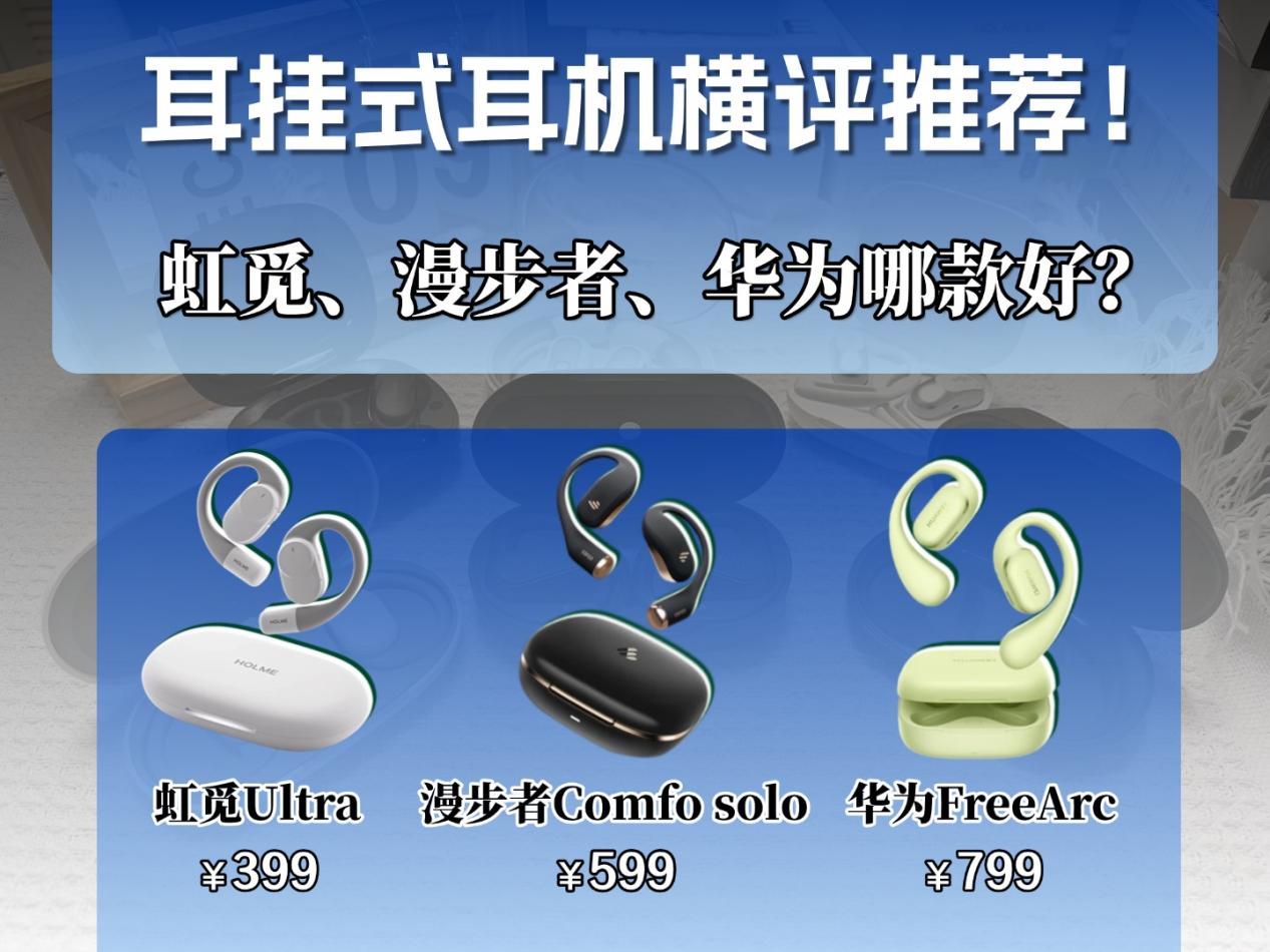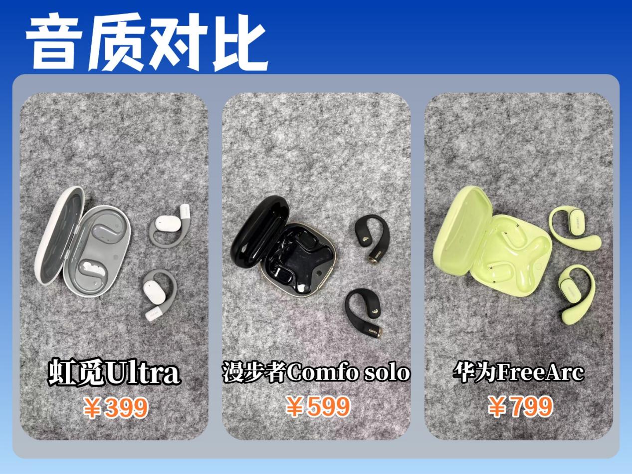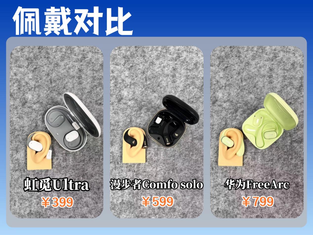 我前前后后实测了十几款开放式耳机,筛出了三款体验能打、性价比还突出的,今天就掰开揉碎了跟大家比一比,给纠结的朋友当个参考。这三款分别是399元的虹觅Ultra、599元的漫步者Comfo solo,还有799元的华为FreeArc。接下来我从大家选耳机最关心的音质、外观、佩戴感,还有实际使用里的防漏音、续航这些点,好好说说它们的不一样,帮你挑到最合心意的那一款。