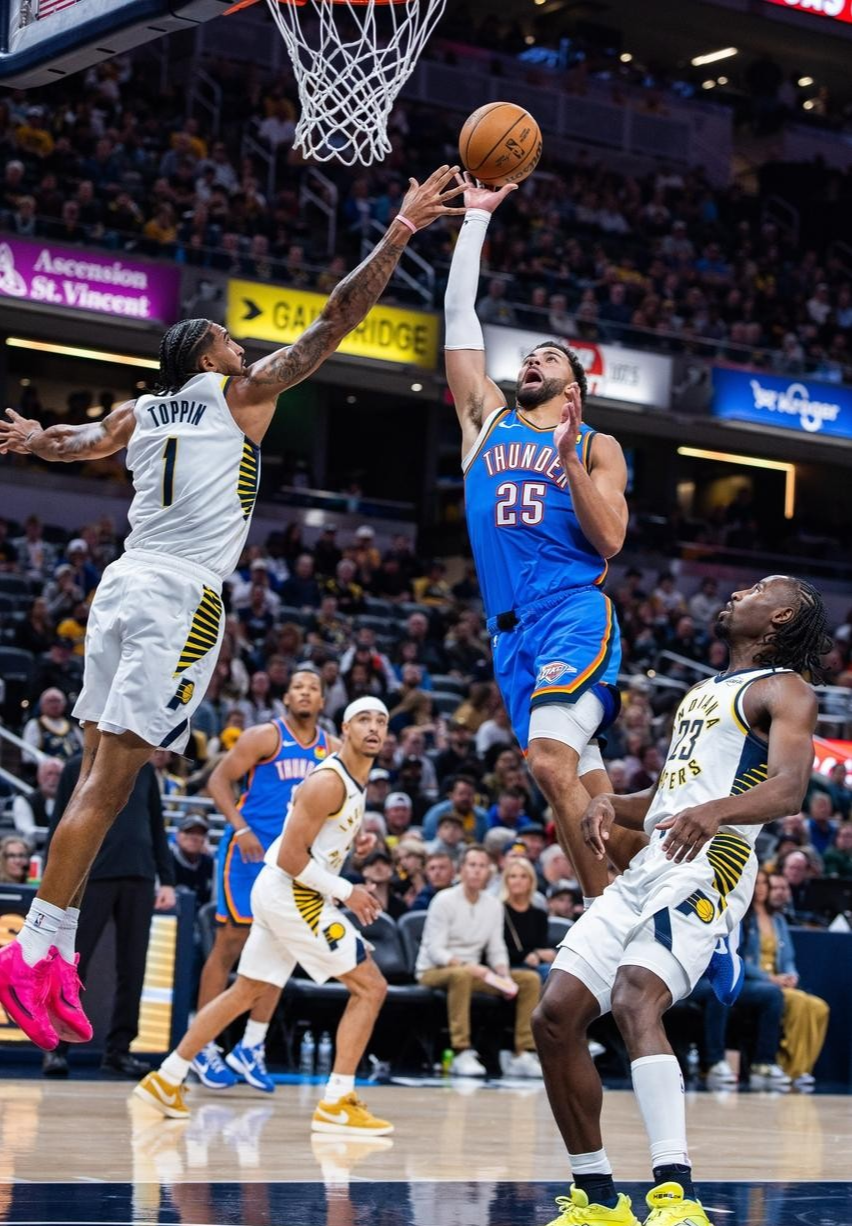 雷霆队在常规赛前两场另外一个发挥不错的是后场米切尔,面对步行者队后场形同虚设的防守,他今天也是砍下了生涯新高的26分,往后他应该会是雷霆队轮换的重要一员,至少在二阵容他应该可以在进攻端给予球队一些帮助。