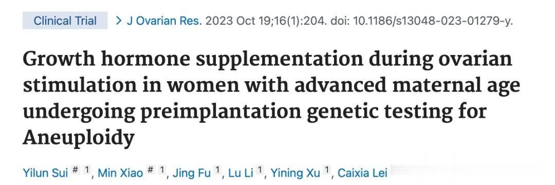 Growth hormone supplementation during ovarian stimulation in women with advanced maternal age undergoing preimplantation genetic testing for Aneuploidy. J Ovarian Res. 2023 Oct 19;16(1):204. doi: 10.1186/s13048-023-01279-y.